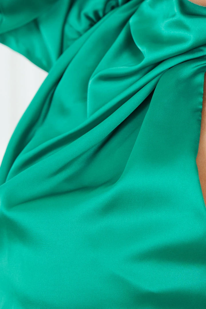 Our Consuelo Top comes in an emerald green colour. Left to be admired, this elegant blouse is a one shoulder showstopper that features a high neckline, a single bishop sleeve elasticated on the cuff and a crop length that falls on the waist. The draping details and satin fabric add drama and is perfect to pair with a tulip skirt and ankle wrap heels.