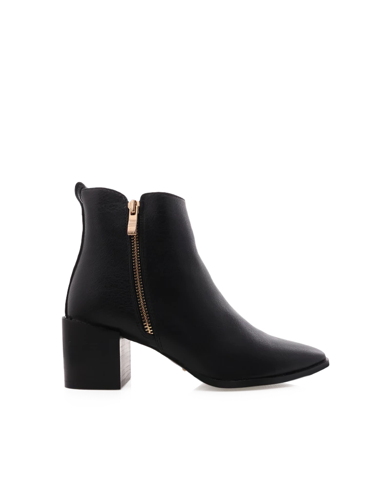 - Key Features: Mid block heel. Closed soft pointed toe. Structured upper. Inner and outer zip detailing. Back pull tab. Easy slip on design. Closed heel counter. Synthetic upper, lining and outsole. Heel height 6.2cm.