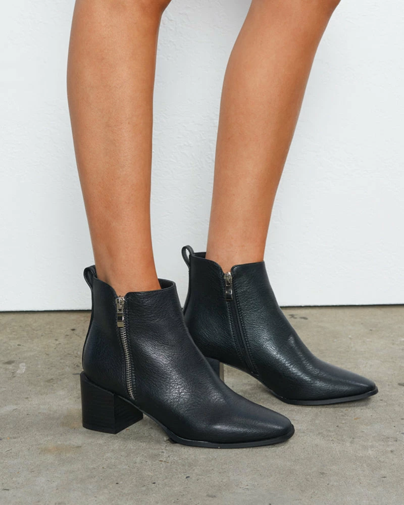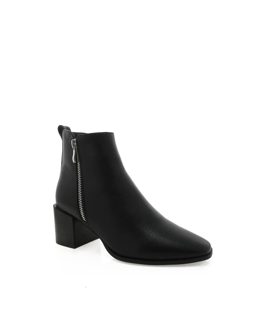 Our Oliver boots come in a classic black tone color. This features a mid block heel, an inner and outer zip detailing, and a closed soft pointed toe. These boots a casual everyday ankle boot that you’re sure to love this trans-season!