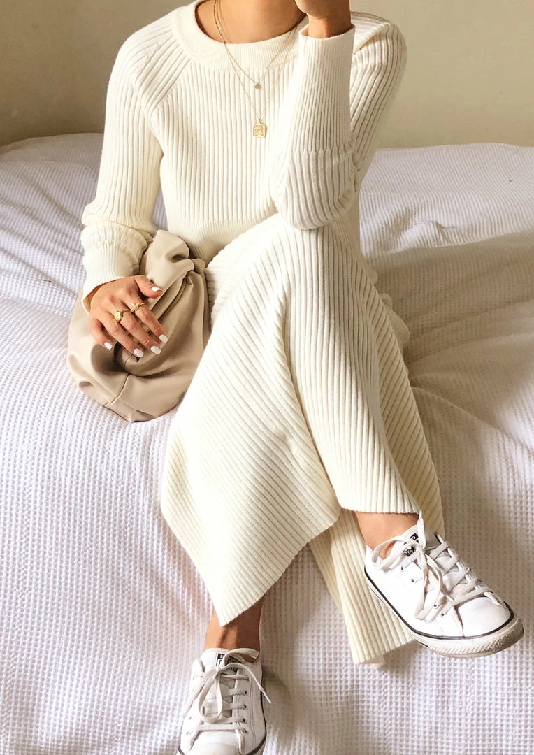 - Key Features: Medium weight minimal-stretch fabric. Unlined (not sheer). Ribbed knit detailing. Cinched waist. Midi length.
