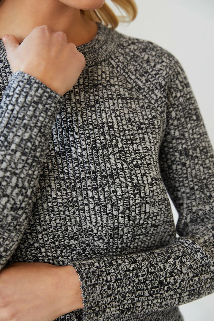 Our Margo Top comes in a sandy grey-black tone. It features a round neckline, long fitted sleeves and ribbed knit detailing all over the garment. Pair with our gorgeous Margo Skirt for a luxurious matching outfit!