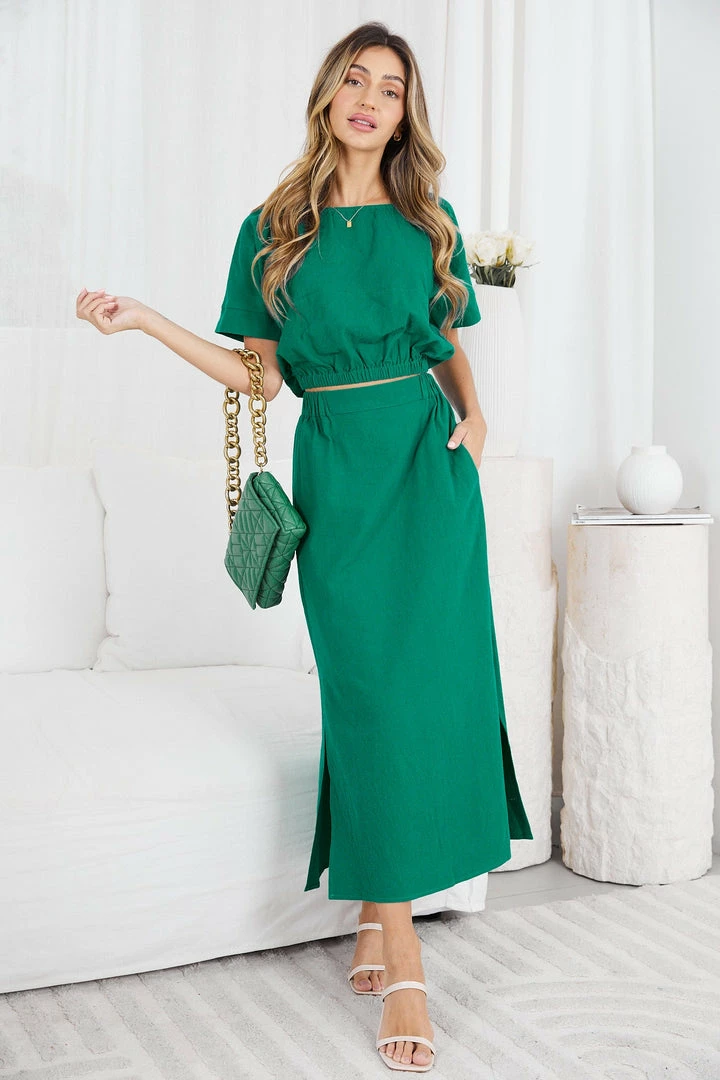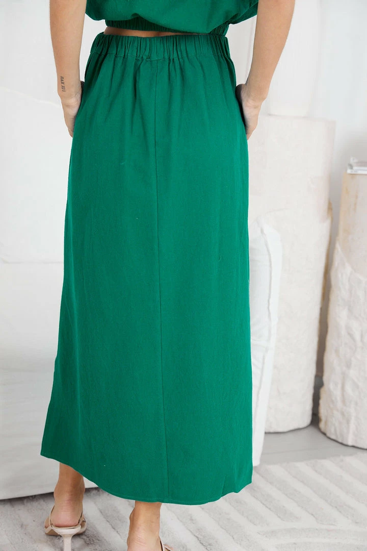 Our Ammeline Skirt comes in a fun green color. This midi features an elastic waist for comfort and a flowy skirt with a slit at the side. Pair with our Ammeline Top to complete the look!