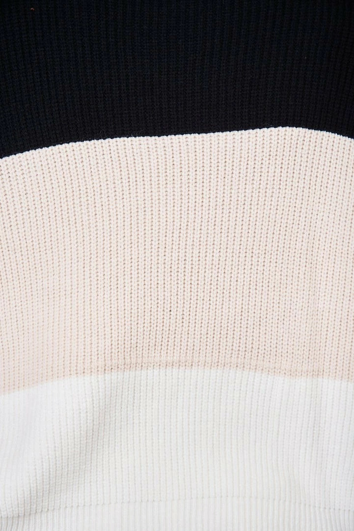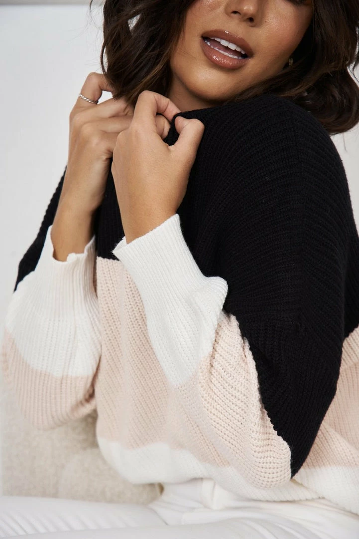 Our Brandy Knit comes in a pink, black and cream tone stripe print. It features a round neckline, long sleeves, and a textured knit pattern all over the garment. This cute knit is perfect for layering during the cold winter months!