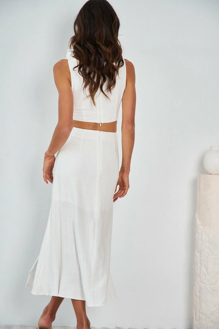 Our Izzy Dress comes in fresh white tone. It’s a sleeveless midi that features a boat neckline and a cutout at the waist. This flowy midi pairs beautifully with heels for a stunning look this spring season!