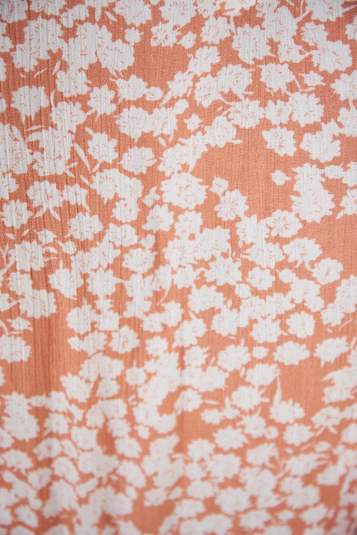 Our Marnie Dress comes in a rust tone base, with a white tone print. It features a v neckline, short sleeves, and a layered skirt. This flowy midi pairs beautifully with heels for a relaxed summer look!
