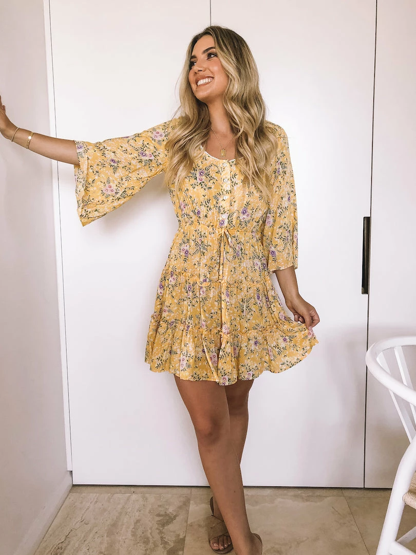 Our Micaela Dress comes in a vibrant yellow base featuring a cream, purple and green toned floral print. The round neckline, buttons down the front, relaxed flutter sleeves, adjustable waist drawstring, and frill detailing on the skirt are stunning additions to this mini. This feminine mini is perfect for picnic dates or catching up with friends over coffee!
