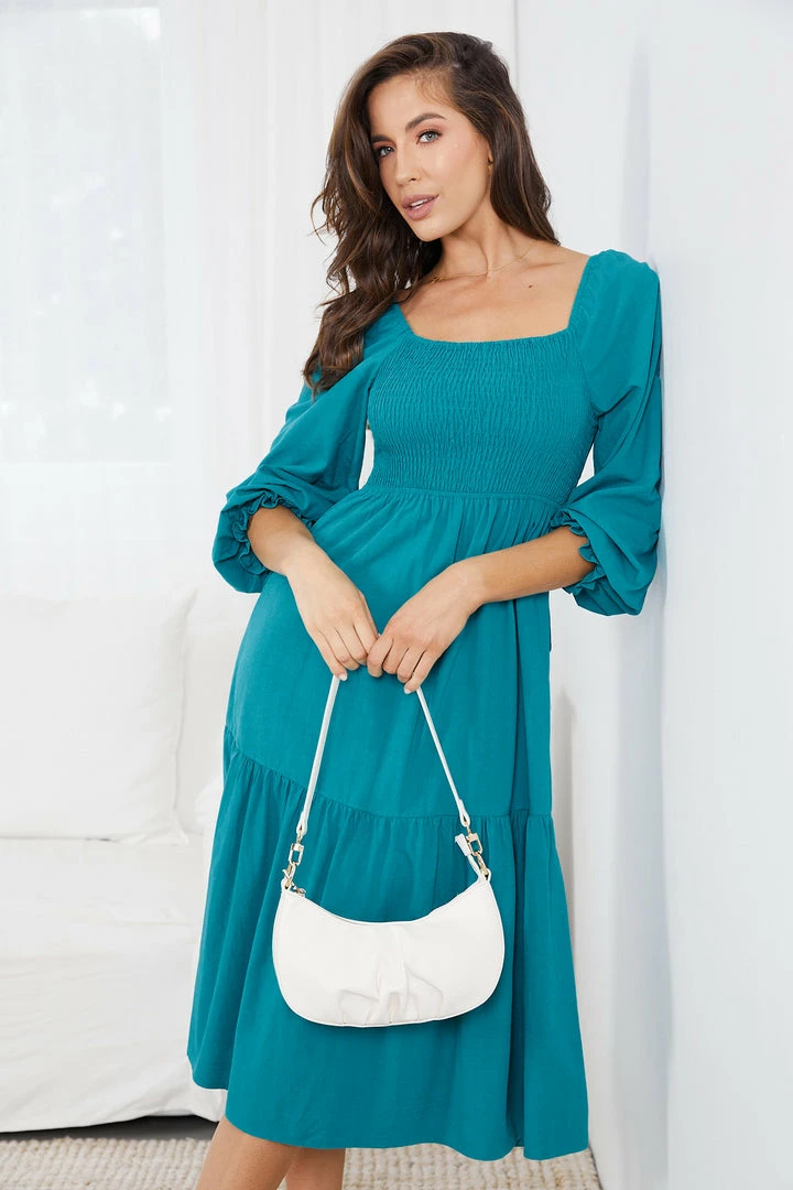 Our Rosette Dress comes in a lovely teal colour. One piece – many ways, this versatile midaxi length dress can be worn backwards and features a square or a sweetheart neckline, long sleeves with micro frills on the cuffs, long tiered skirt, a cutout on the waist inserting a touch of tease and a smocked or twisted detailing on the bust for a feminine drama. Match it with a sunhat and beach sandals for a quick stroll at the seaside.