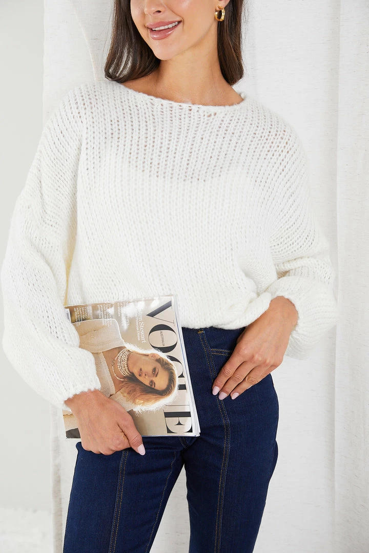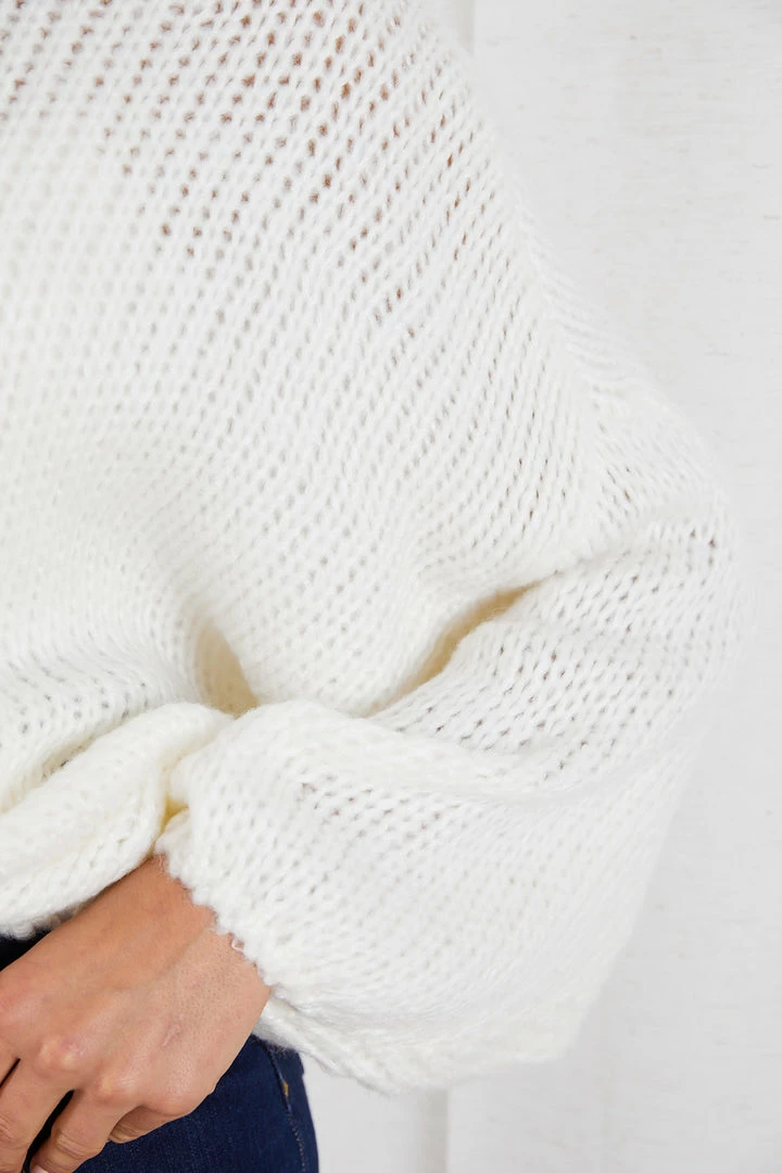 Our Zinny Knit comes in an off-white colour. Fashion meets comfort in this cosy knit top that features a high round neckline and long balloon sleeves for a roomy fit. Pair with leggings for a lazy day outfit or complete the look with our Violeta Jeans – Indigo Wash.
