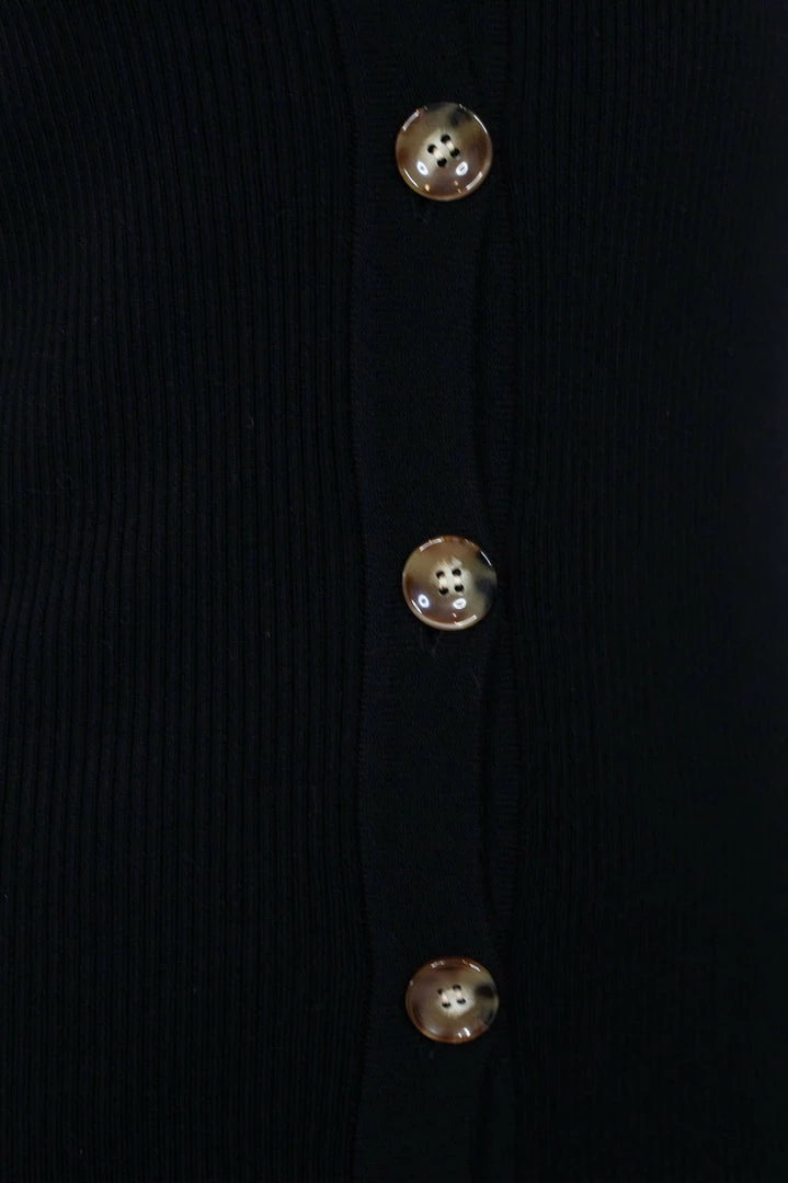 Our Colombina Cardigan comes in a deep black tone. It features a v neckline, long relaxed sleeves, and button detailing down the front of the garment. This versatile piece can be worn as a cardigan, or on its own as a knit dress! Pair this with your favourite pair of tan sandals for an effortless transseasonal look.