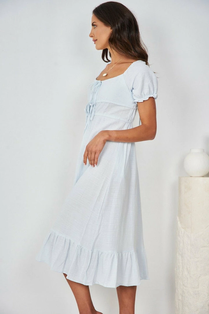 Our Kayleah Dress comes in a light blue tone. It features a square neckline and short sleeves with tie detailing. This flowy midi pairs beautifully with heels for a stunning transseasonal look!