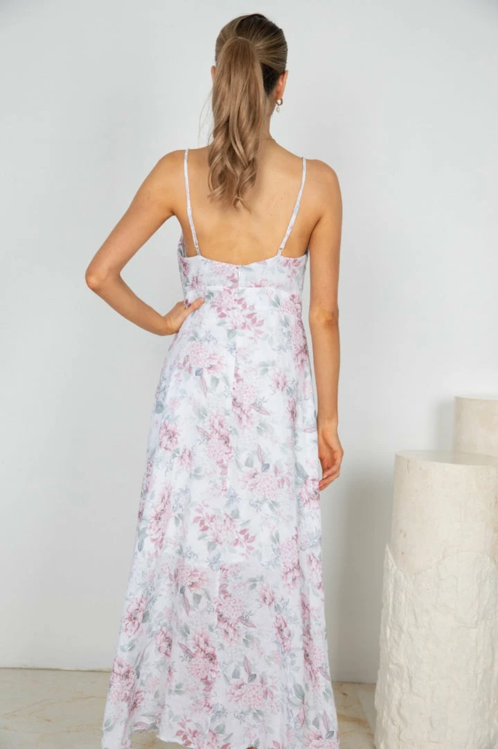 Our Kerenza Dress comes in a white tone base, with a pink and grey tone print. It features a v neckline & spaghetti straps for a relaxed, comfortable fit. This flowy midi is the perfect addition to your spring wardrobe!