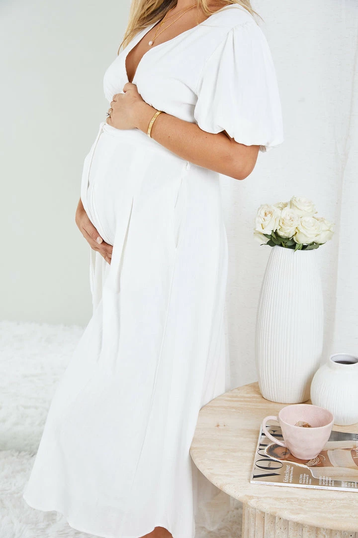 - Key Features: Short sleeves with frill detailing. V neckline and buttons on front. Midi length. Gathered bust and waist detailing. Relaxed skirt. Maternity friendly.