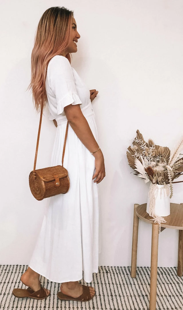 Our Korbela Dress is a fresh white tone. It’s a lovely medium weight linen material in a relaxed and effortless fit, perfect for hot summer days & baby bumps. This breathable number features a v neckline with buttons on front making this not only feminine & flirty but ideal for maternity wear. The midi length is a conservative feature you’re sure to appreciate on windy days. The frill detail on the short sleeves is a cute addition. Pair with your fave strappy sandals and straw bag for a great picnic or beach outfit.