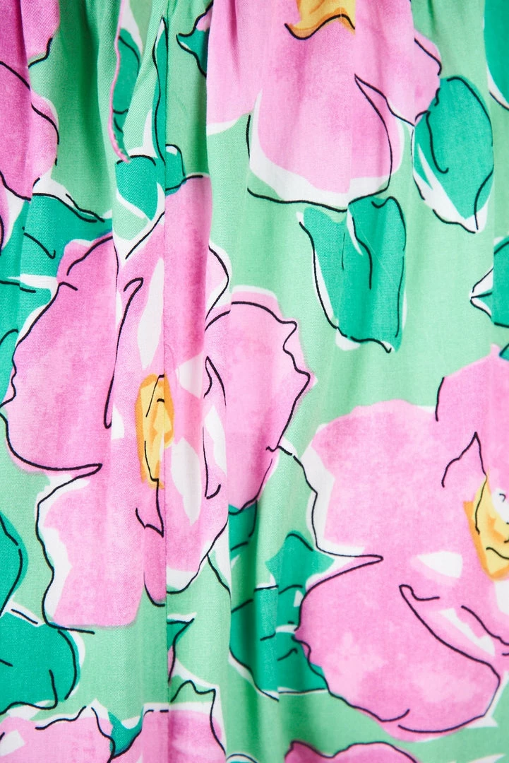 Our Marylou Dress comes in a green tone base, with a purple & yellow tone floral print. It features a square neckline, short sleeves, and cutouts at the waist. This flowy midi is a gorgeous addition to your spring wardrobe!