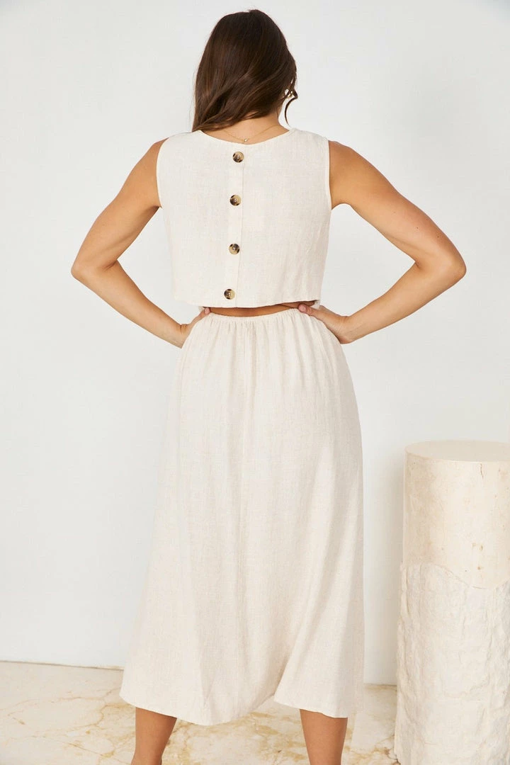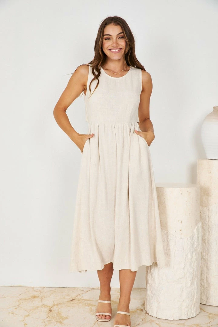 Our Melly Dress comes in a classic neutral beige tone. It’s a sleeveless midi that features a round neckline and a relaxed skirt for a comfortable fit. This midi is a wonderful addition to your spring wardrobe!