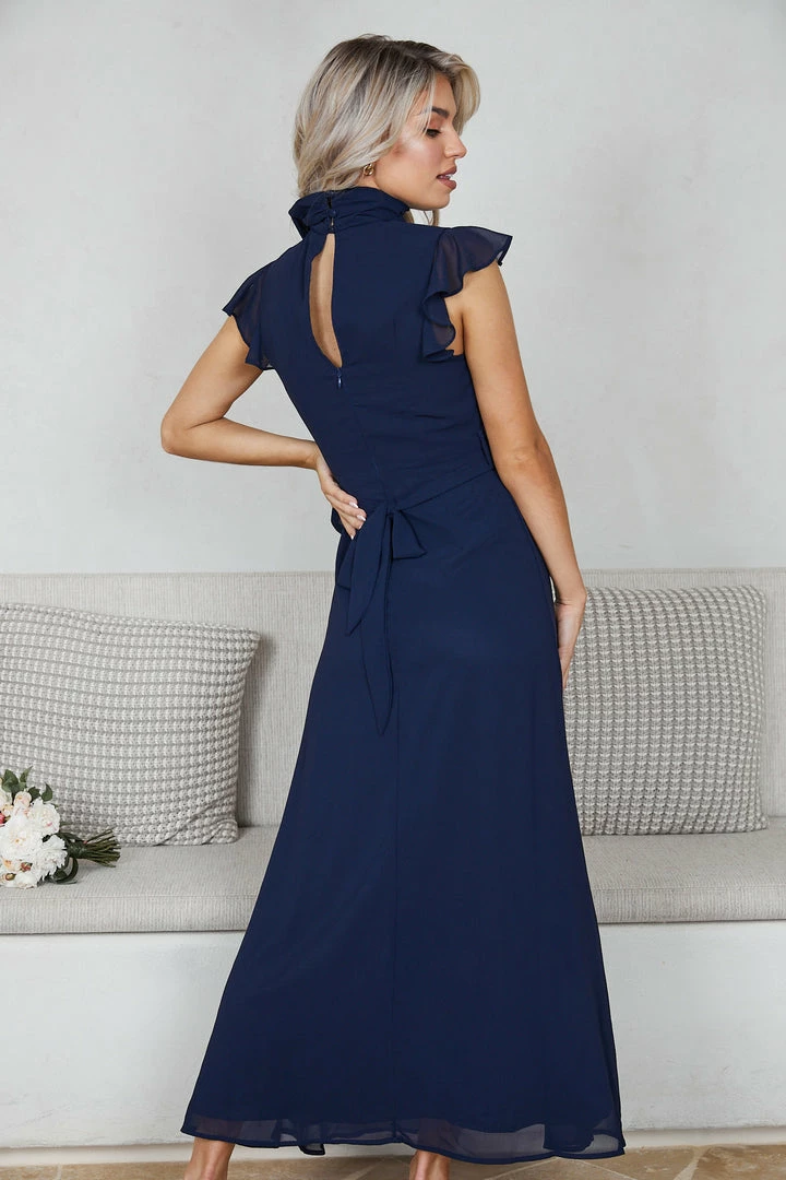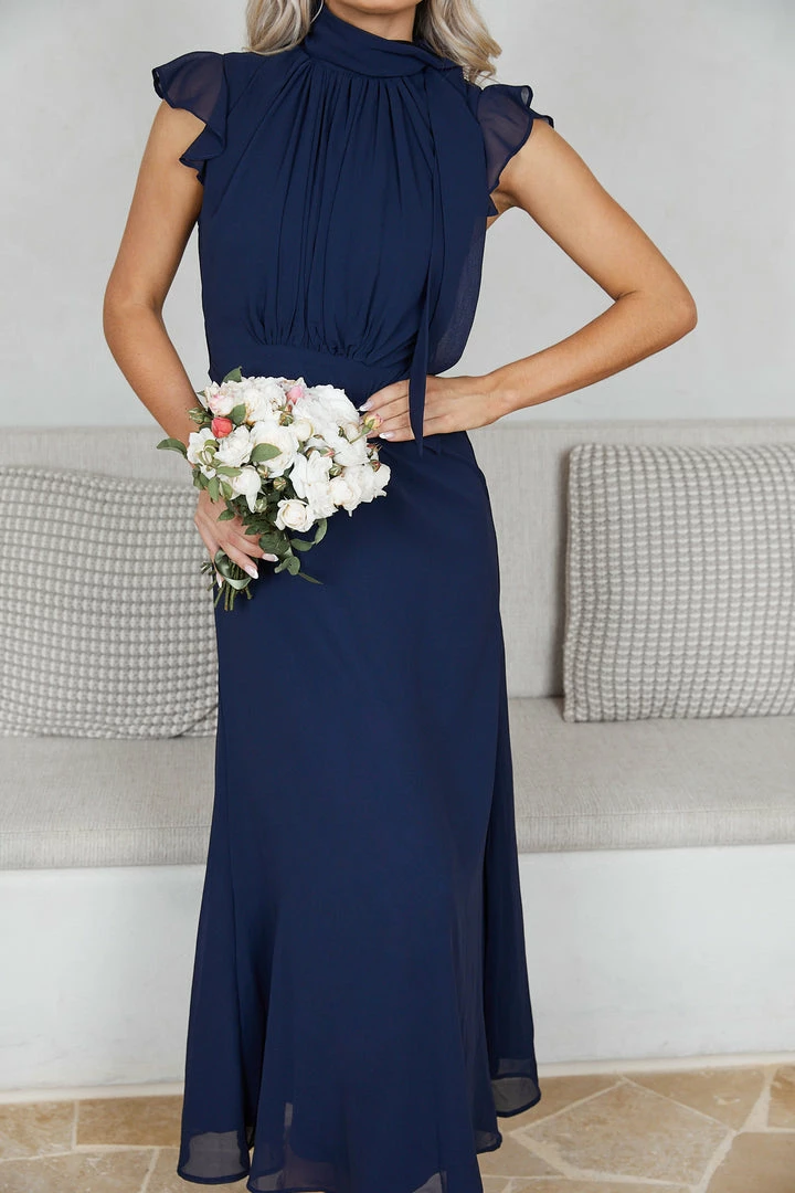 Our Zita Dress comes in a navy blue tone color. This midi comes in a lightweight non-stretch fabrication that you’re sure to love during the warmer months. The gorgeous tie-up neckline and short butterfly sleeves are feminine & comfortable additions to this garment. You are sure to draw every eye in the room!