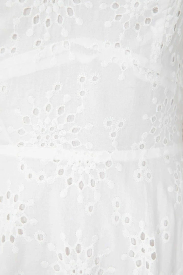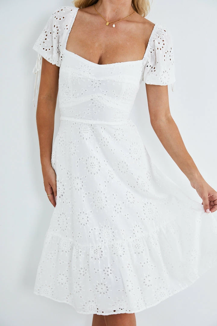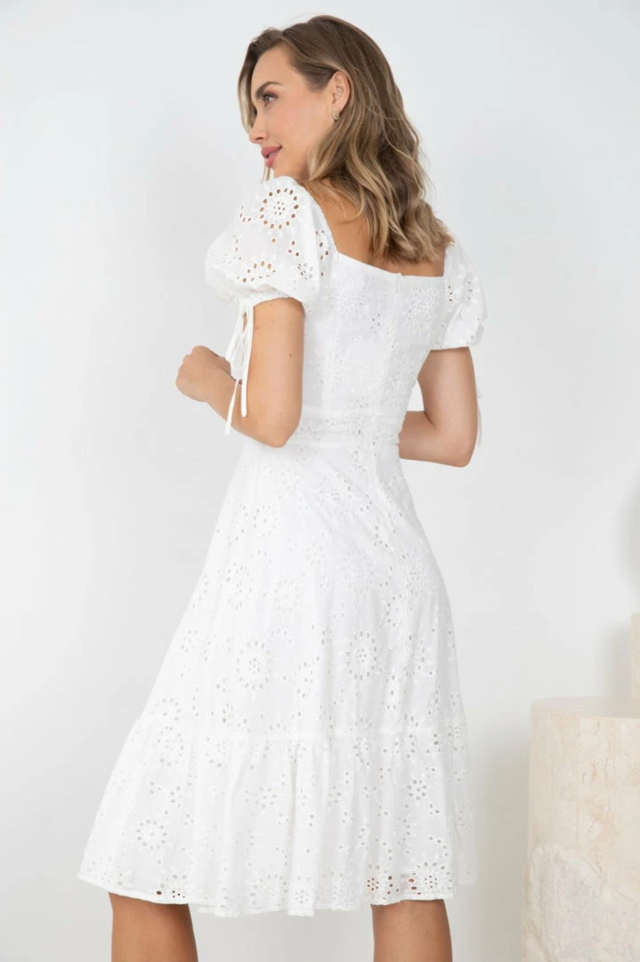 Our Avalina Dress comes in a crisp white tone. It features a sweetheart neckline, short sleeves, and an embroidered pattern all over the garment. This flowy midi pairs beautifully with heels for a stunning seasonal look!