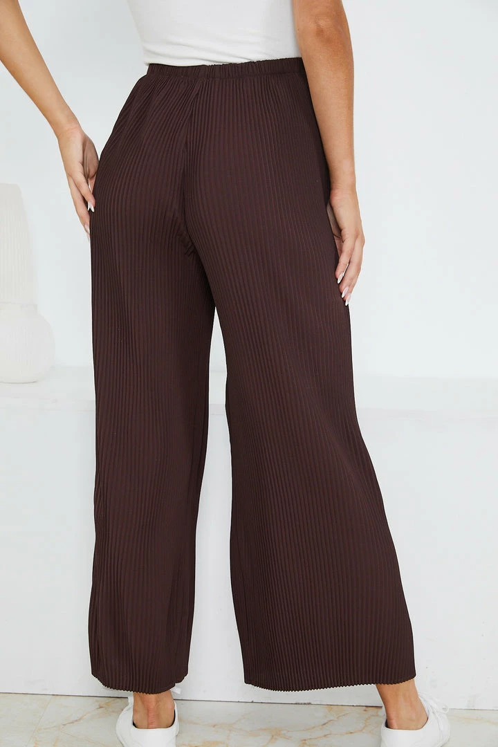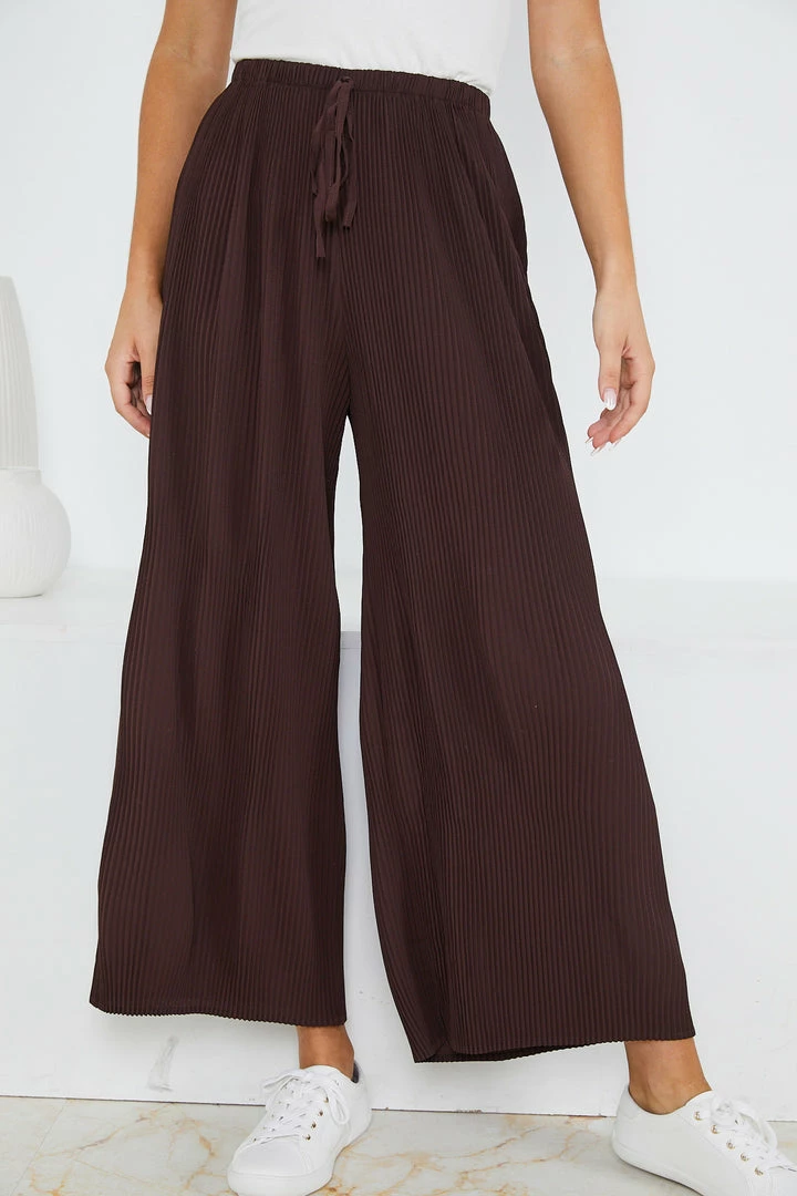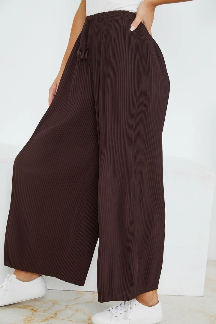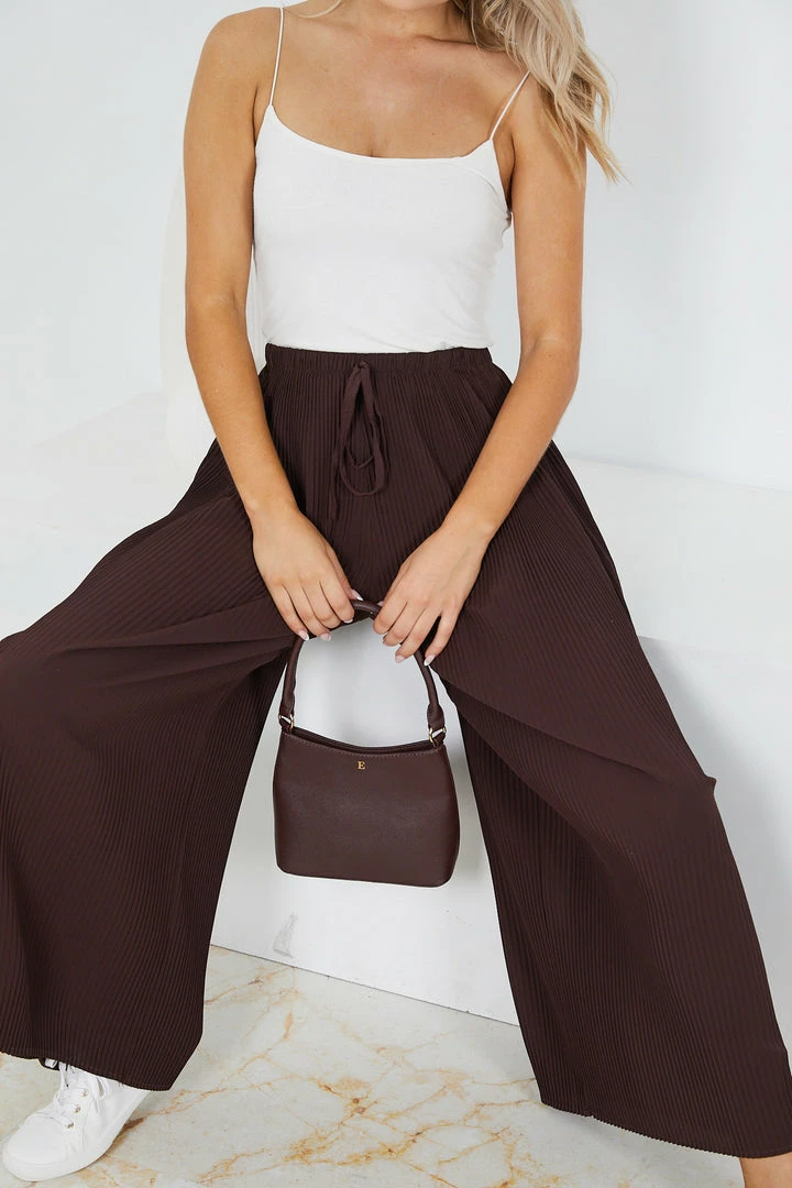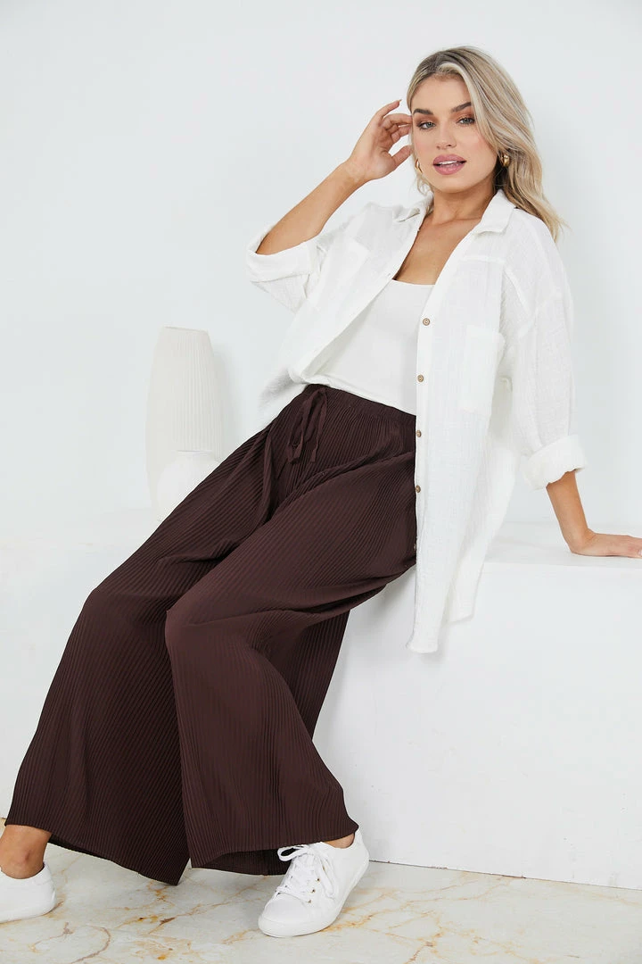 Our Minosa Pants come in a chocolate brown color. These pants are so comfortable thanks to their lightweight fabric, relaxed silhouette, and drawstring waist that allows for a customized fit. Wear them with simple tank tops and T-shirts this summer, and slip into a pair of slides for an easy look you’ll never tire of.