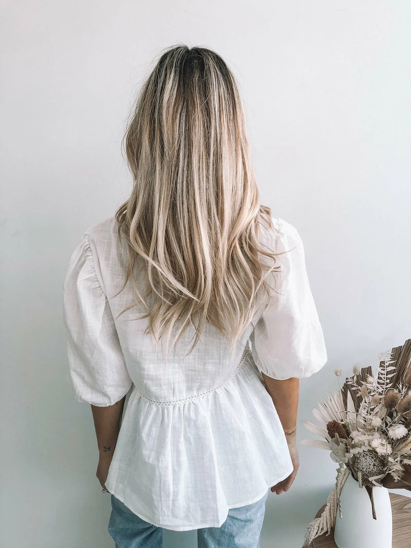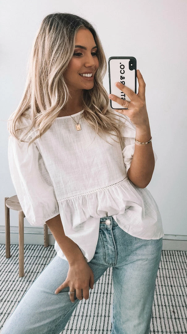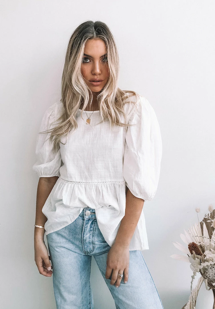 Our Tonya Top is the basic of your dreams, this stunning top features 3/4 balloon sleeves with cinched cuffs for a dash of drama and a feminine frill hemline for a voluminous edge. The micro crochet detailing along the waist is a stunning & subtle bohemian addition you’re sure to love.