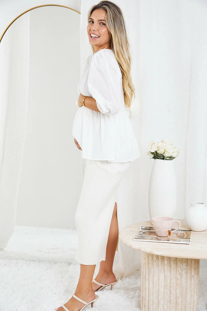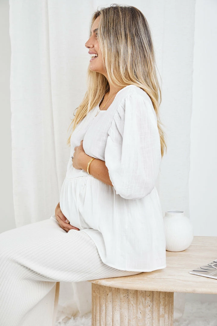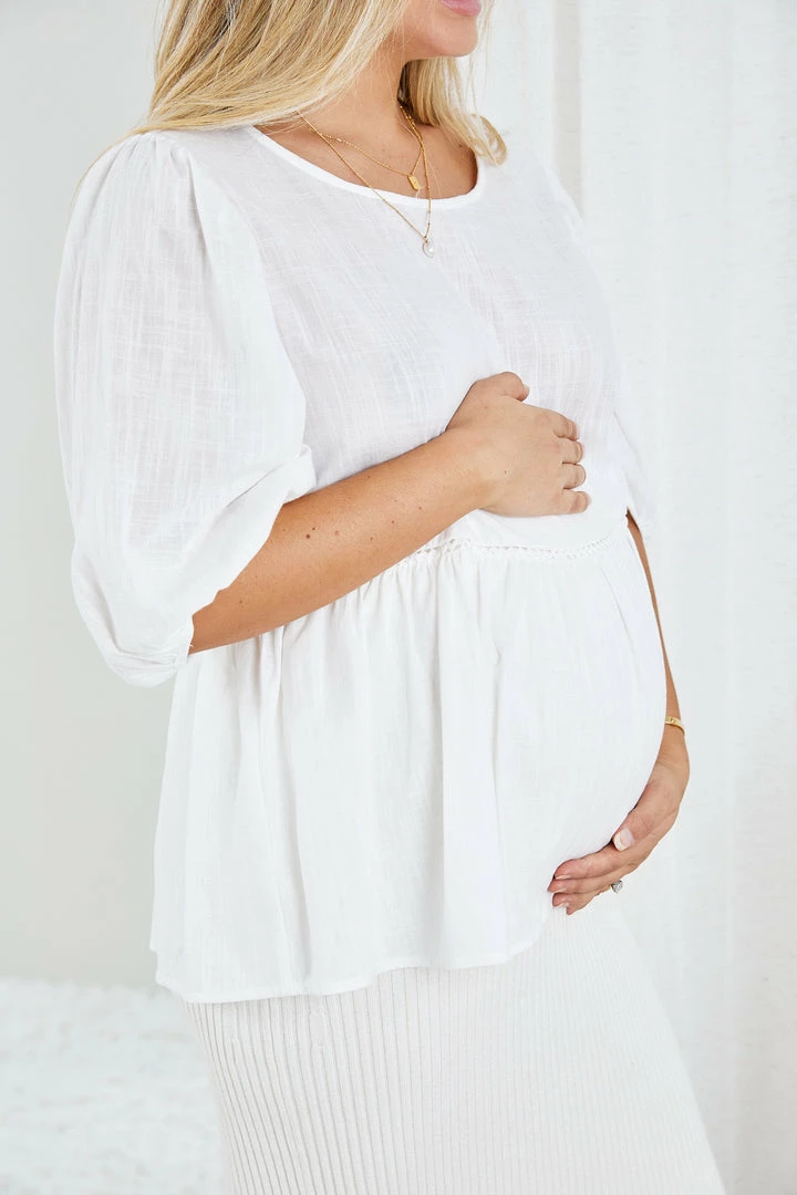 - Key Features: 3/4 balloon sleeves with cinched cuffs. Relaxed fit. Round neckline. Frill hemline. Micro crochet detailing on waist. Bump friendly