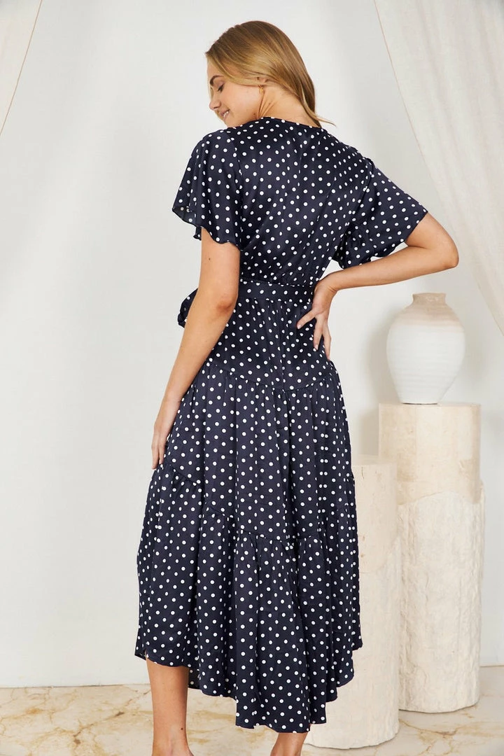 Our Given Dress comes in a navy blue tone base, with a white tone spot print. This relaxed fit midi features a layered high low hemline and wrap-like bust with an elastic waist and fabric waist tie to beautifully cinch in the figure. The butterfly short sleeves and relaxed fit make this ideal for maternity wear and provide ultimate comfort whilst looking your best.