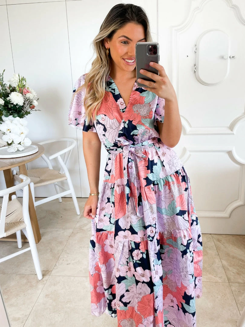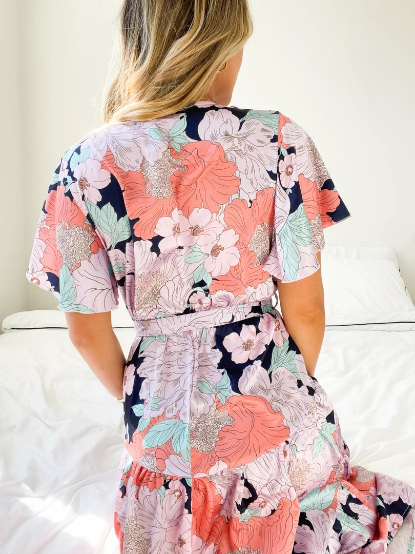 Our Given Dress comes in an orange, pink, & light blue tone floral print. This relaxed fit midi features a layered high low hemline and wrap-like bust with an elastic waist and fabric waist tie to beautifully cinch in the figure. The butterfly short sleeves and relaxed fit make this ideal for maternity wear and provide ultimate comfort whilst looking your best.