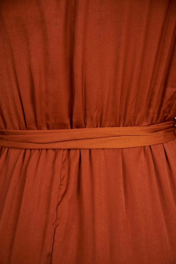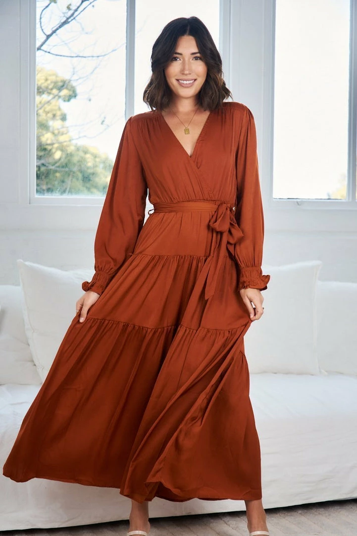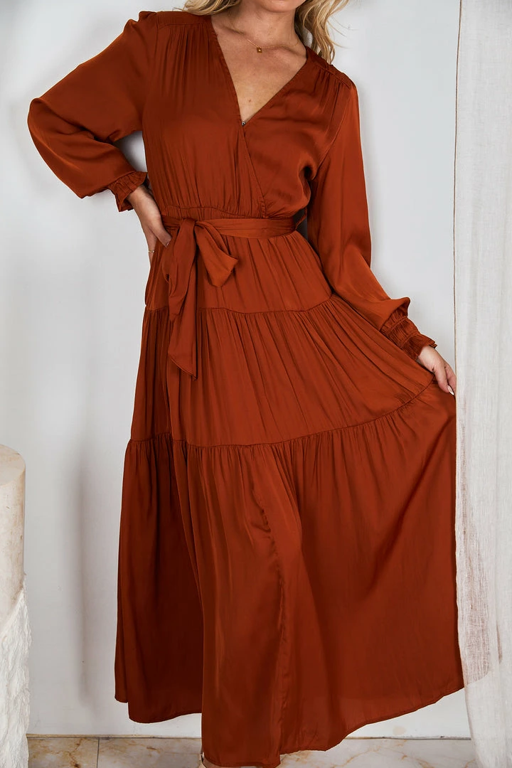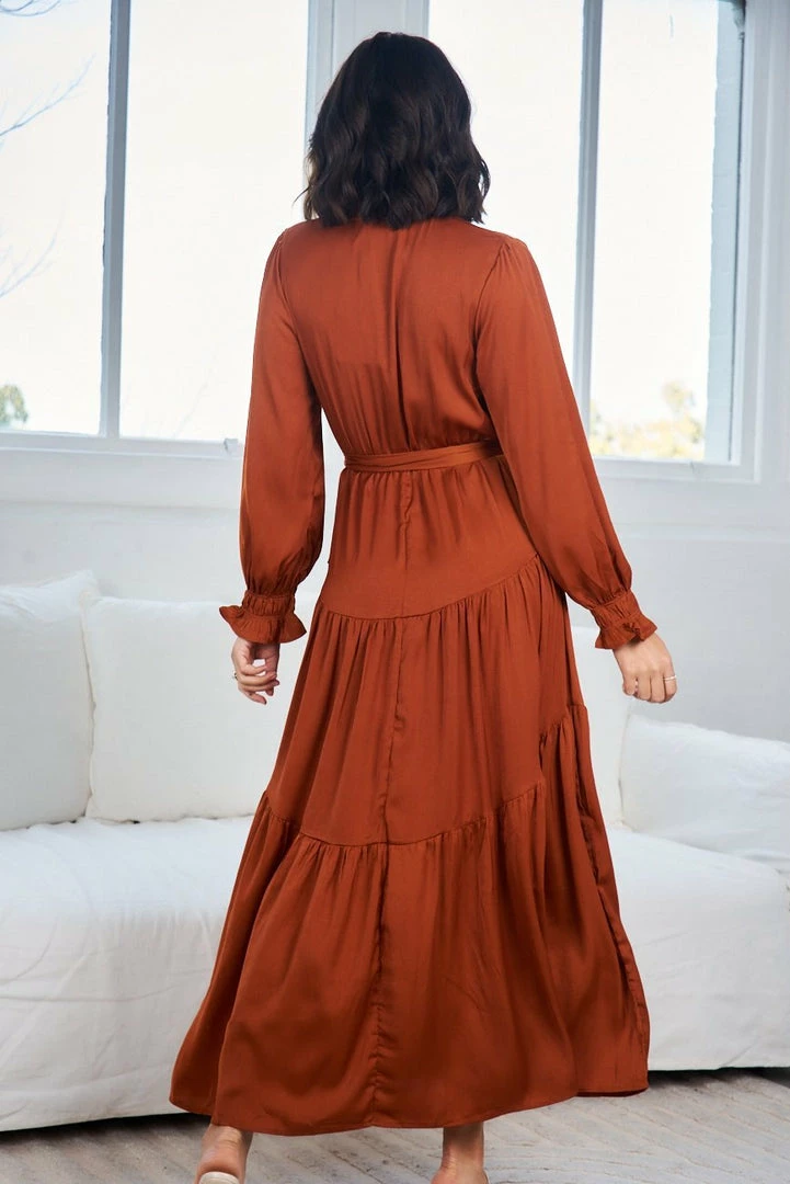 Our Sienna Dress comes in an orange rust tone. It features a v neckline, long bishop sleeves, a tiered skirt, and a fabric waist tie to cinch in the figure beautifully. This flowy midi pairs wonderfully with heels for a stunning formal look!