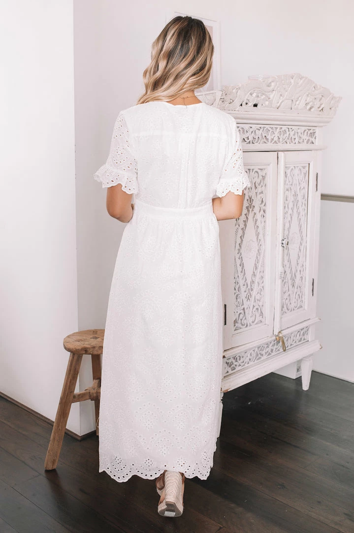 - Key Features:Â Broderie Anglaise fabrication. Short sleeves with frill detailing. V neckline and buttons on front. Midi-maxi length (dependent on height). Gathered bust and waist detailing. Relaxed skirt. Maternity friendly.