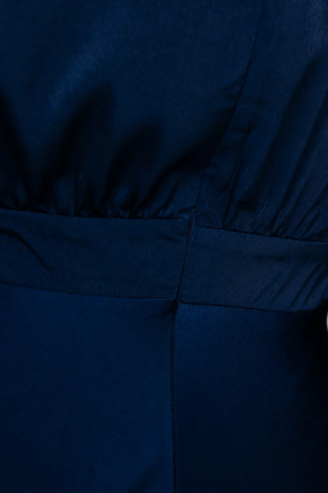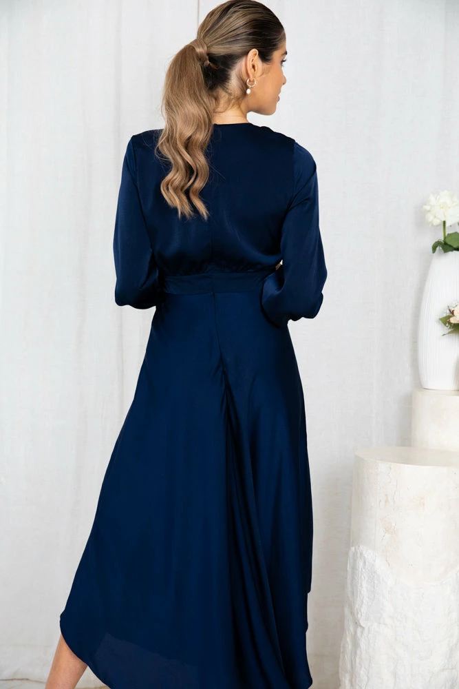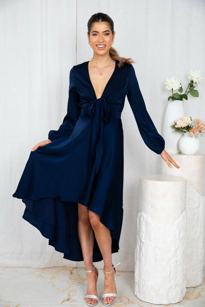 Our Bryleigh Dress comes in a navy blue tone. It features a v neckline and long bishop sleeves, coming together at the front with a fabric tie. This flowy midi pairs beautifully with heels for an effortless trans seasonal look!