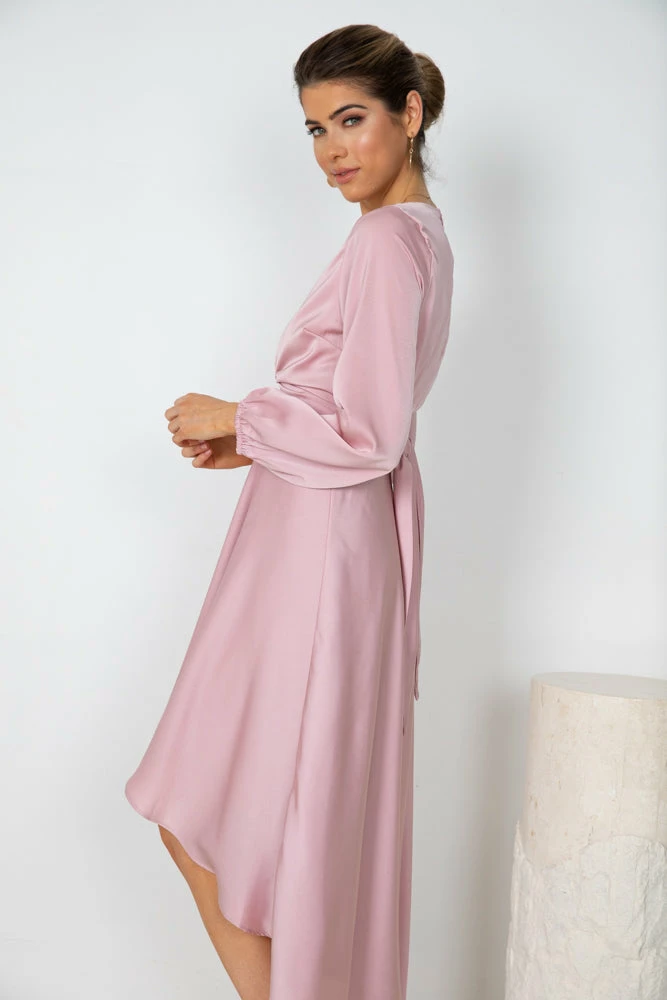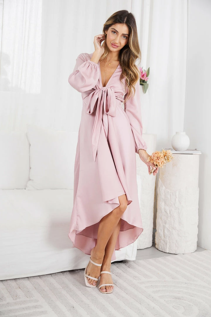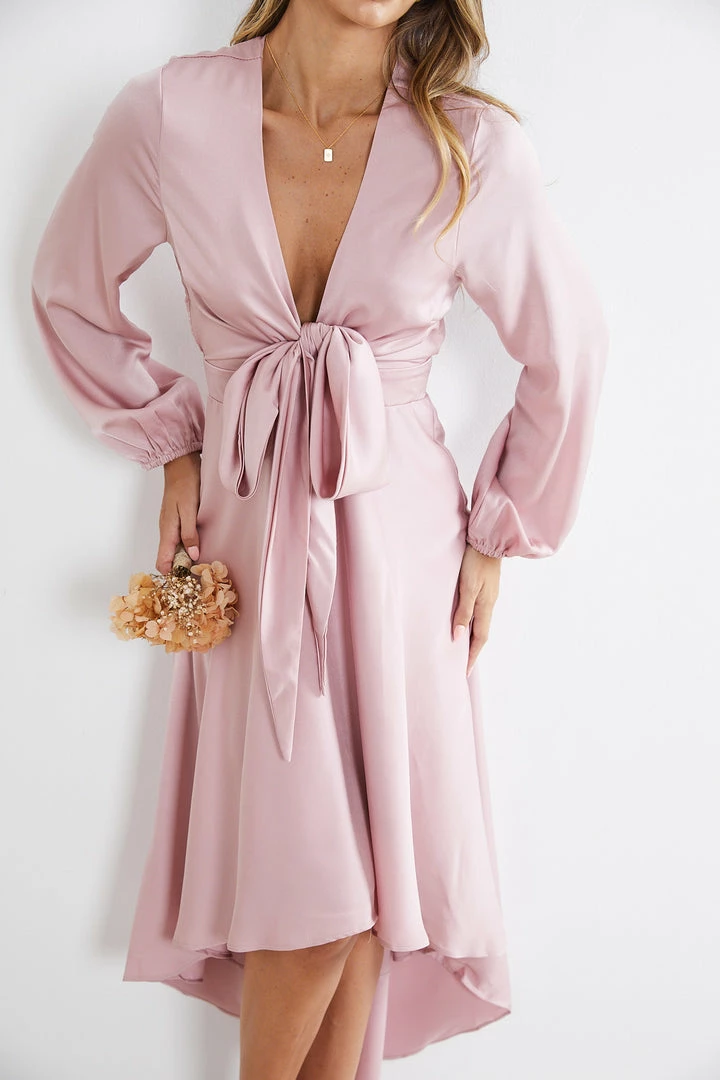 Our Bryleigh Dress comes in a pink blush tone. It features a v neckline and long bishop sleeves, coming together at the front with a fabric tie. This flowy midi pairs beautifully with heels for an effortless trans-seasonal look!
