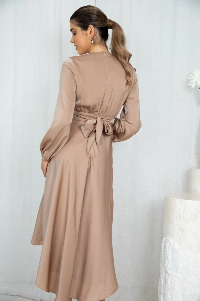Our Bryleigh Dress comes in a mocha brown tone. It features a v neckline and long bishop sleeves, coming together at the front with a fabric tie. This flowy midi pairs beautifully with heels for an effortless transseasonal look!