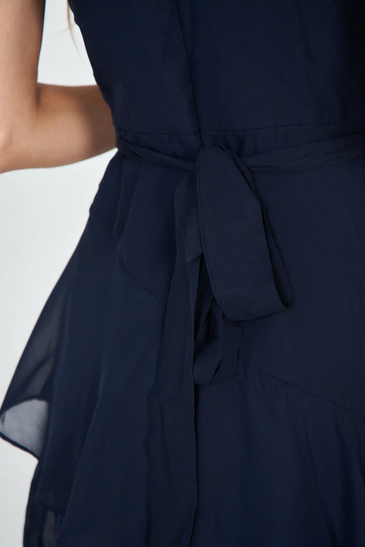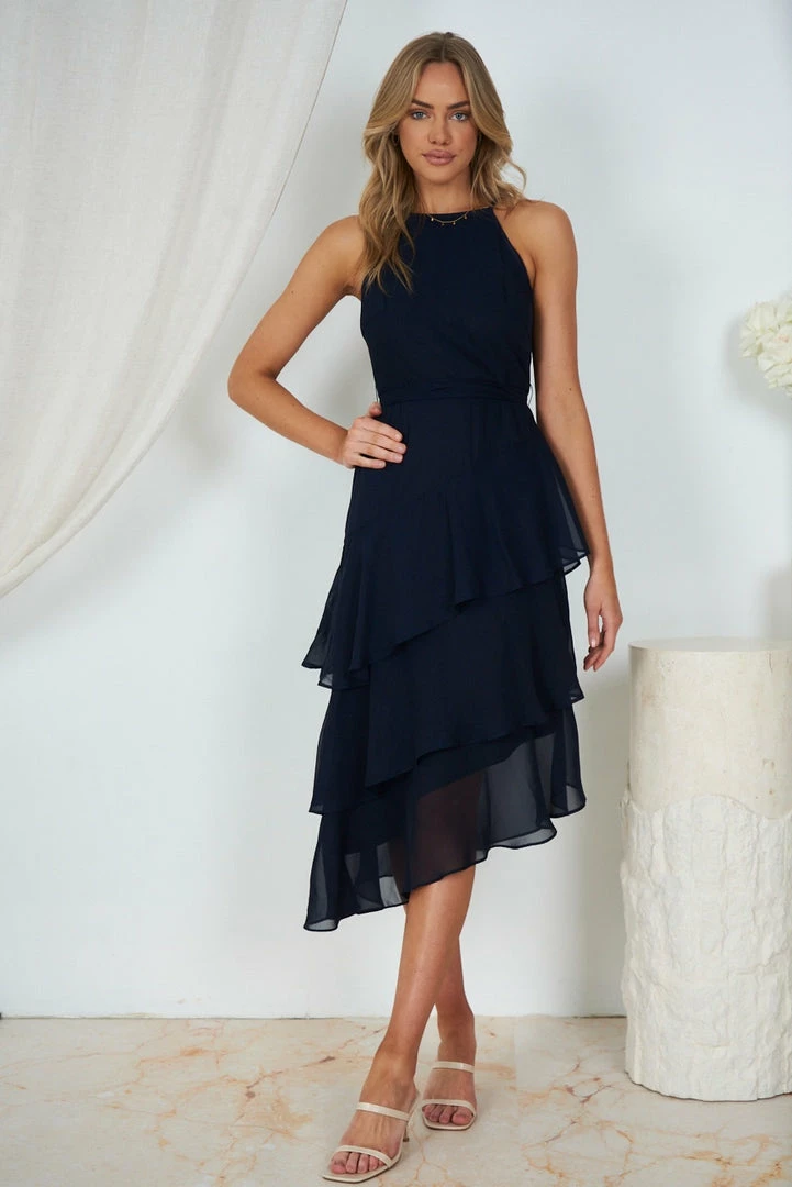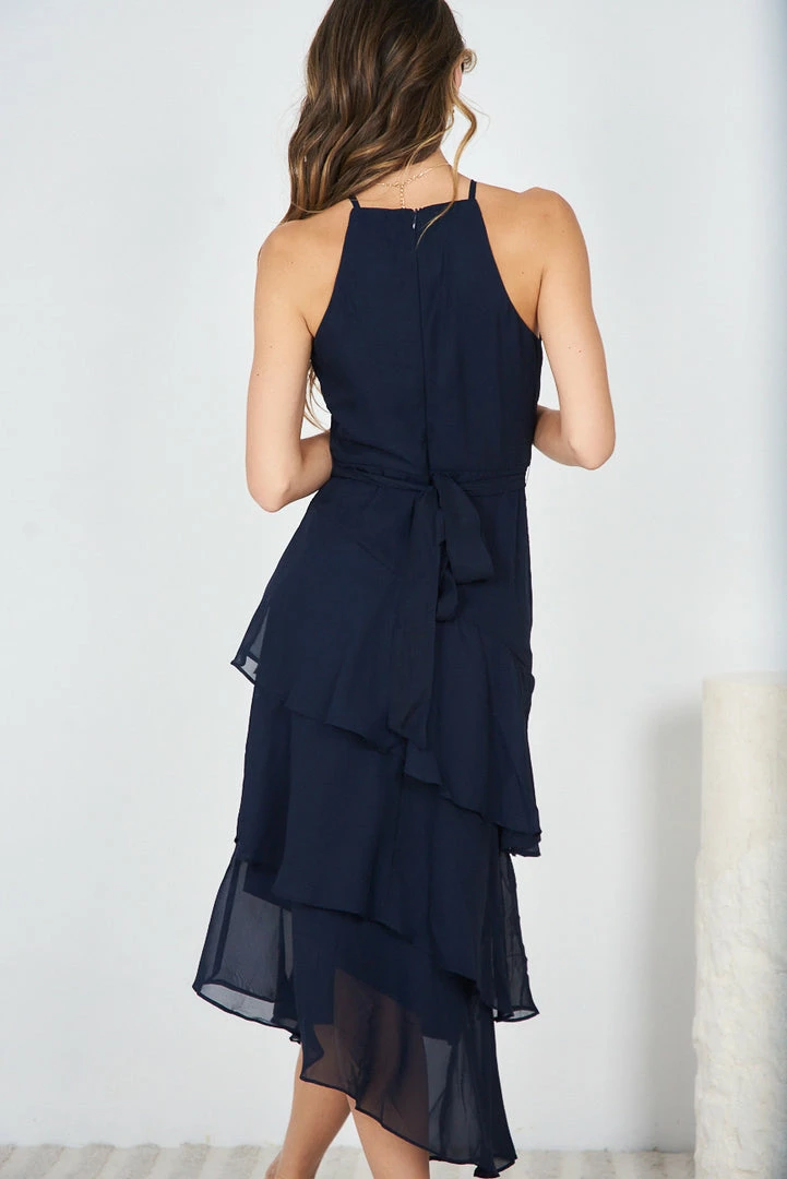 Our Cadence Dress comes in a lovely navy blue tone. This halter neck midi features an adjustable fabric waist tie that cinches in the figure and layered skirt with frill detailing. This piece is perfect for the up and coming summer weddings and work parties.