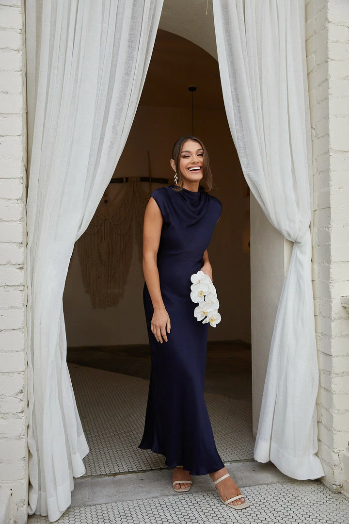 - Key Features: Cowl draped boat neck. Subtle mermaid skirt. Centre back invisible zip. Cap Sleeve. Comfortable. Breathable. Lightweight. Maxi length. Relaxed fit. Occasions: Wedding, Party, Work, and Formal.