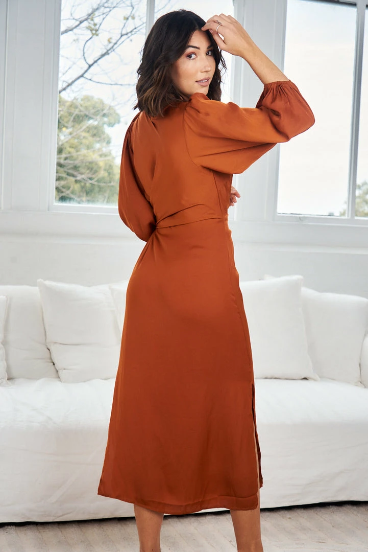 Our Heather Dress is a dark terracotta with baked rose undertones. It’s a gorgeous lightweight material in a flattering & relaxed silhouette. The v neckline, bishop 3/4 sleeves & tie on waist detailing are feminine additions to this classy dress.