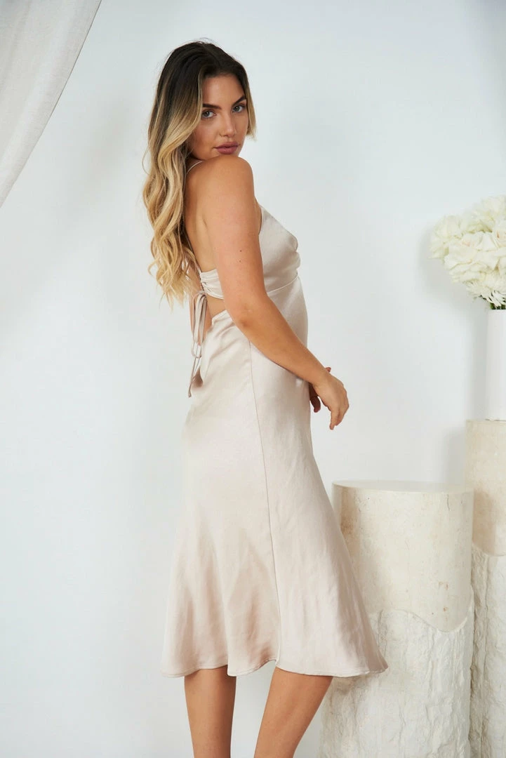 Our Keke Dress comes in a beautiful champagne tone. This slinky midi features a V neckline, twist and cut out detailing on the bust, adjustable spaghetti straps that cross over at the back, and open back with tie detailing. This romantic midi pairs beautifully with black strappy heels.