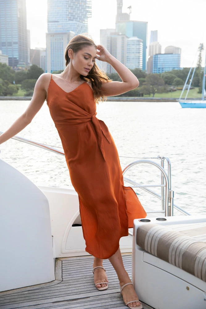Our Laguna Dress has a gorgeous satin effect rust tone in a lightweight non-stretch fabric. This stunning midi features a soft V neckline & side splits that allow for easy strolling. The adjustable straps are customizable to comfort. The slip-style dress features a side tie detail (on the wearer’s left) that you’re sure to love.