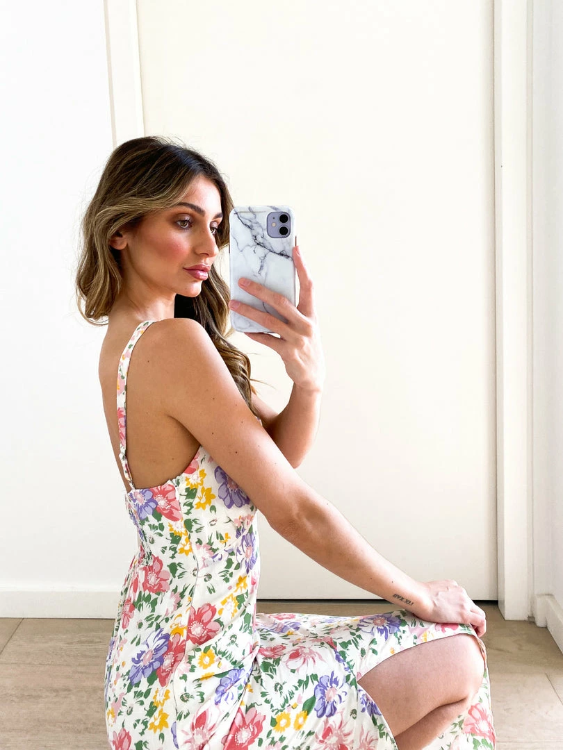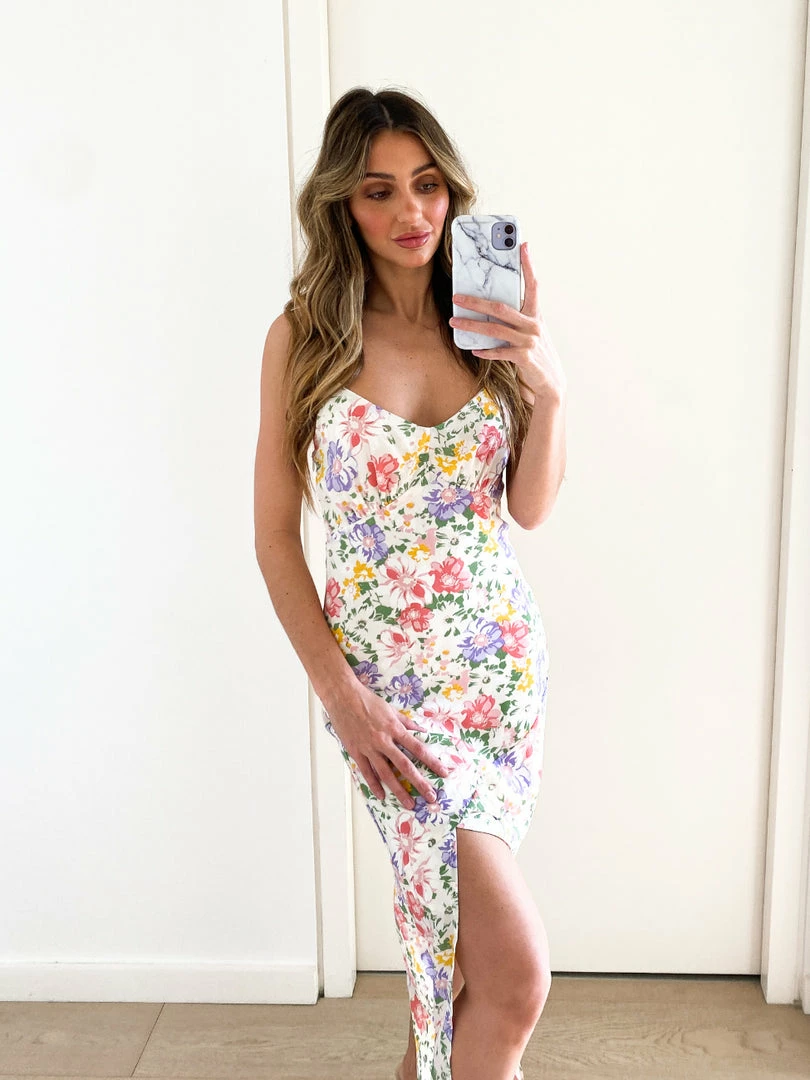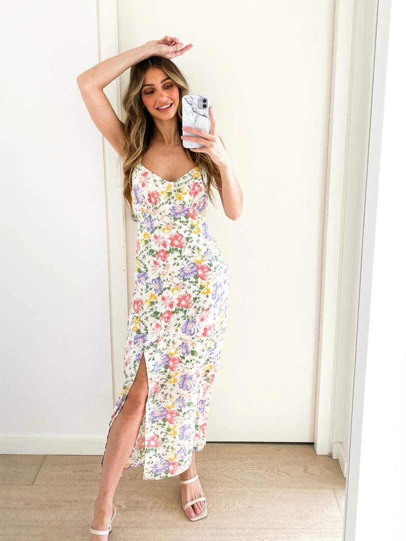 Our Bluebell Dress comes in a white tone base, with a sage, pink ,gold & lilac tone floral print. This sleeveless midi features a sweetheart neckline and a side split in the skirt, and is the perfect addition to your spring wardrobe!