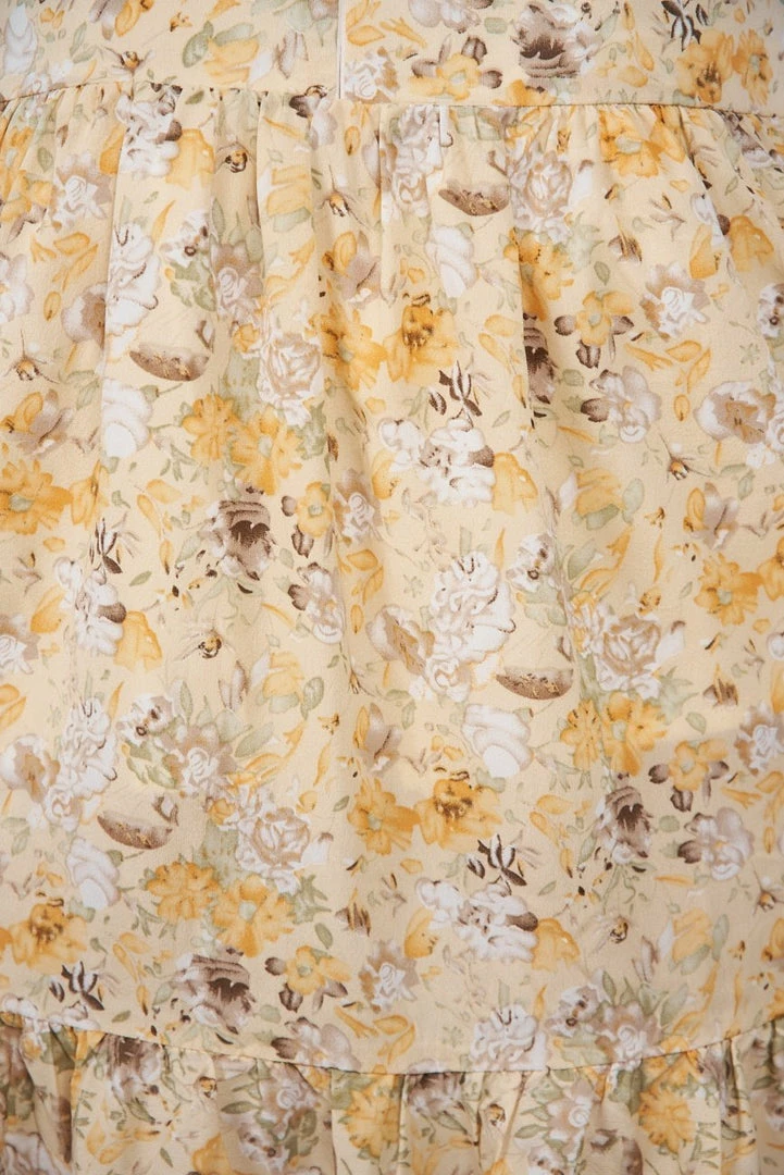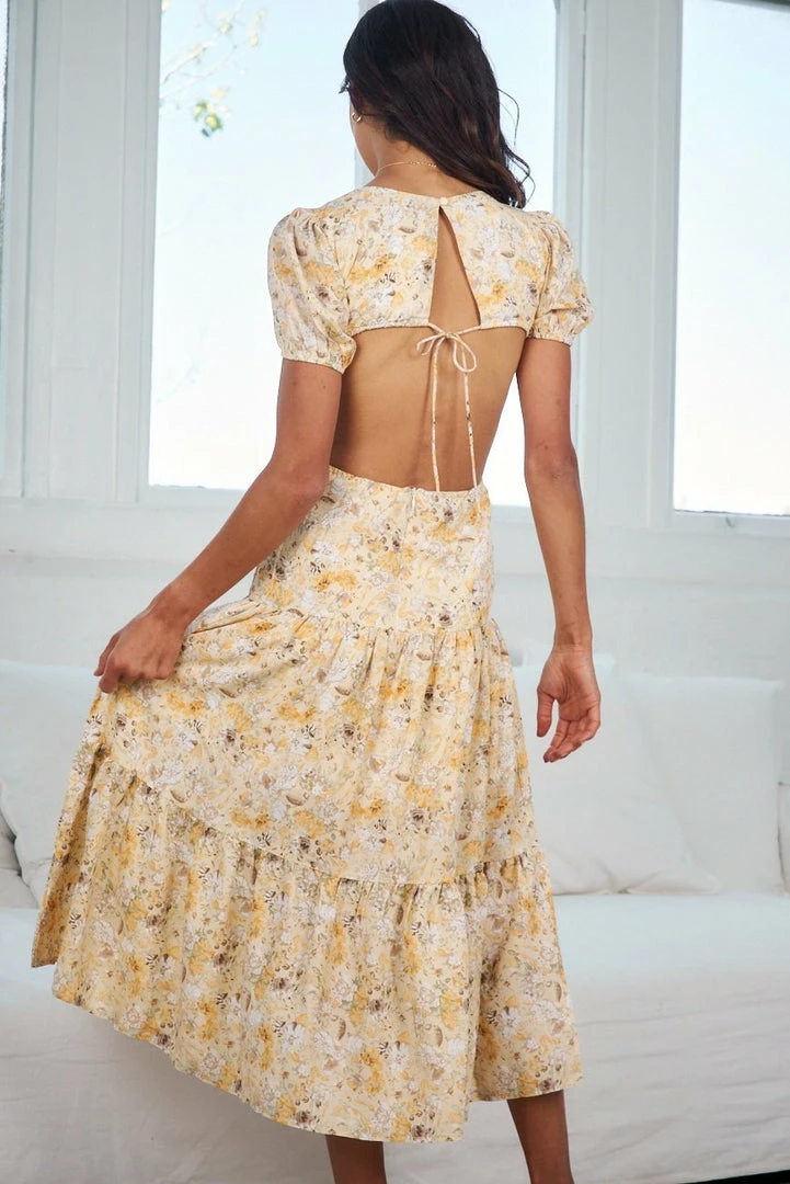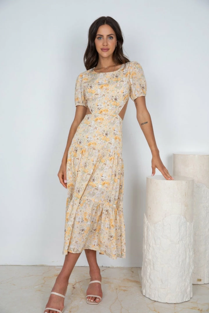 Our Gretel Dress comes in a soft yellow tone base, with a yellow & beige tone print. It features a round neckline, short sleeves, and cutouts at the waist. This flowy midi pairs beautifully with heels for a stunning transseasonal look!