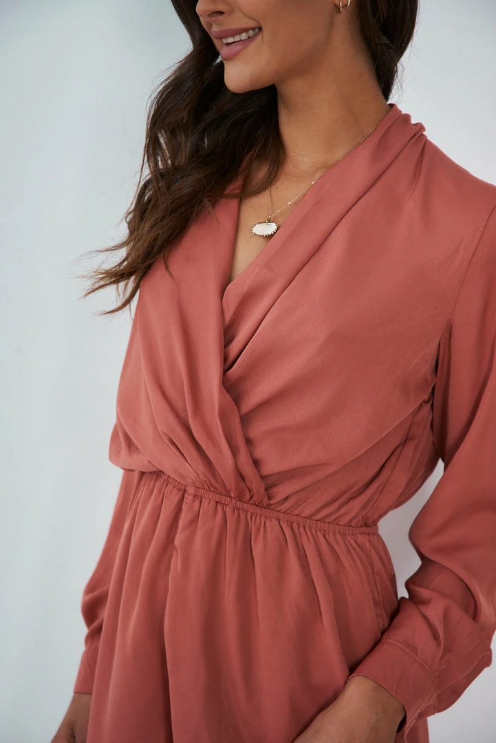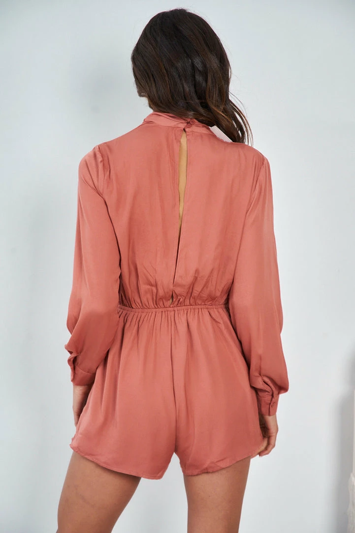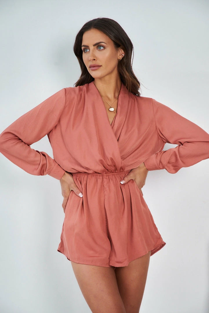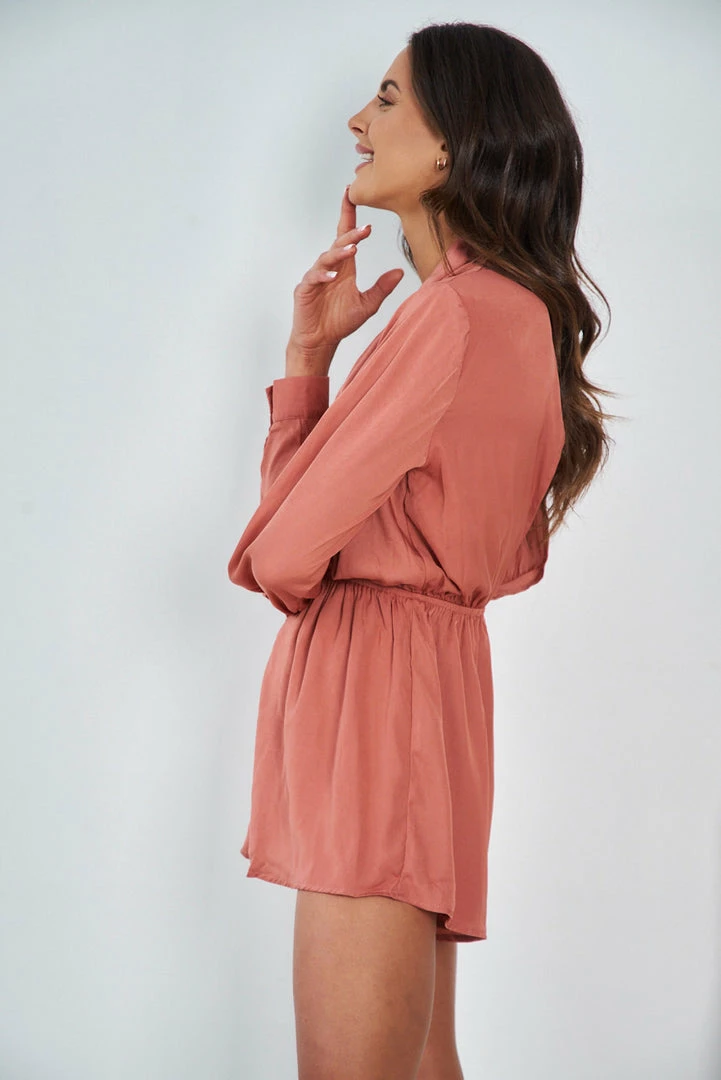 Our Halley Playsuit comes in a light rust tone. It features a v neckline & long sleeves for a relaxed, comfortable fit. This mini-length playsuit pairs beautifully with heels for a stunning transseasonal look!