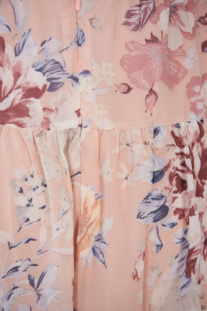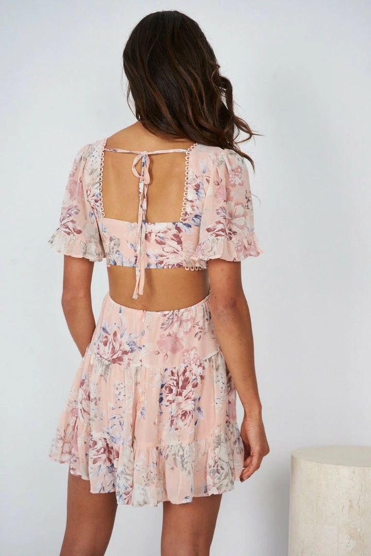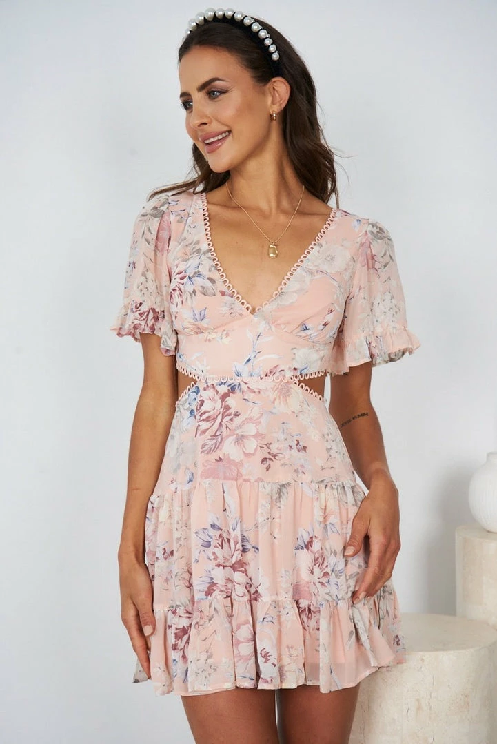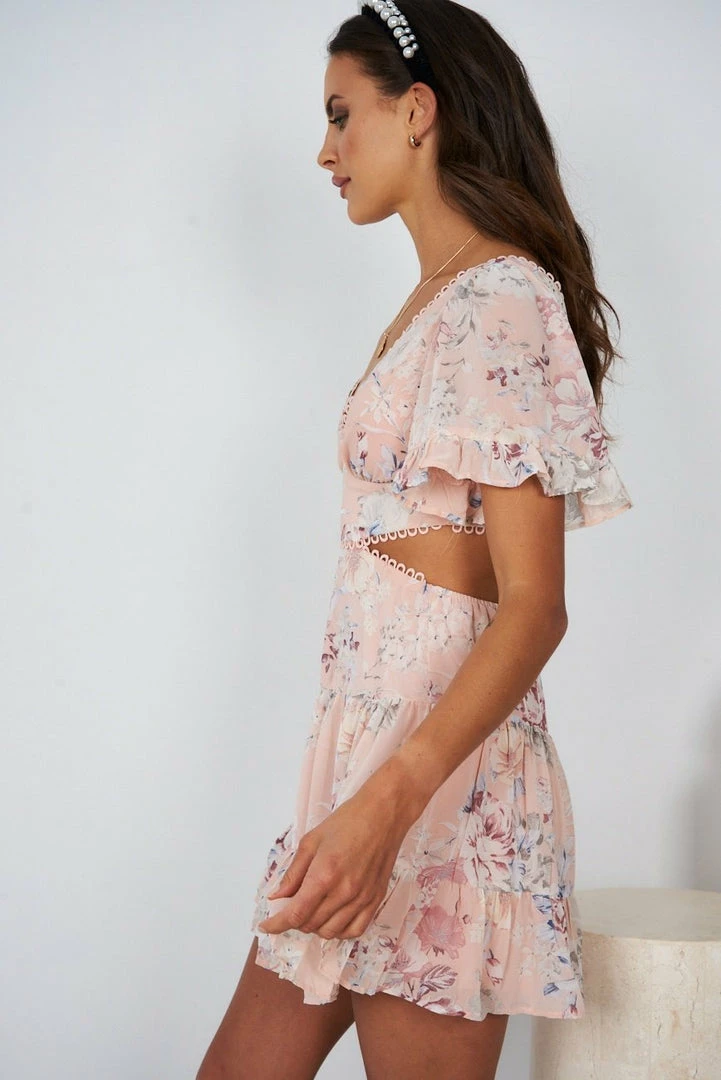 Our Jordi Dress comes in a pink blush tone base, with a grey, burgundy & beige tone print. It features a v neckline, short sleeves, and cutouts at the waist. This flowy mini pairs beautifully with heels for a stunning transseasonal look!