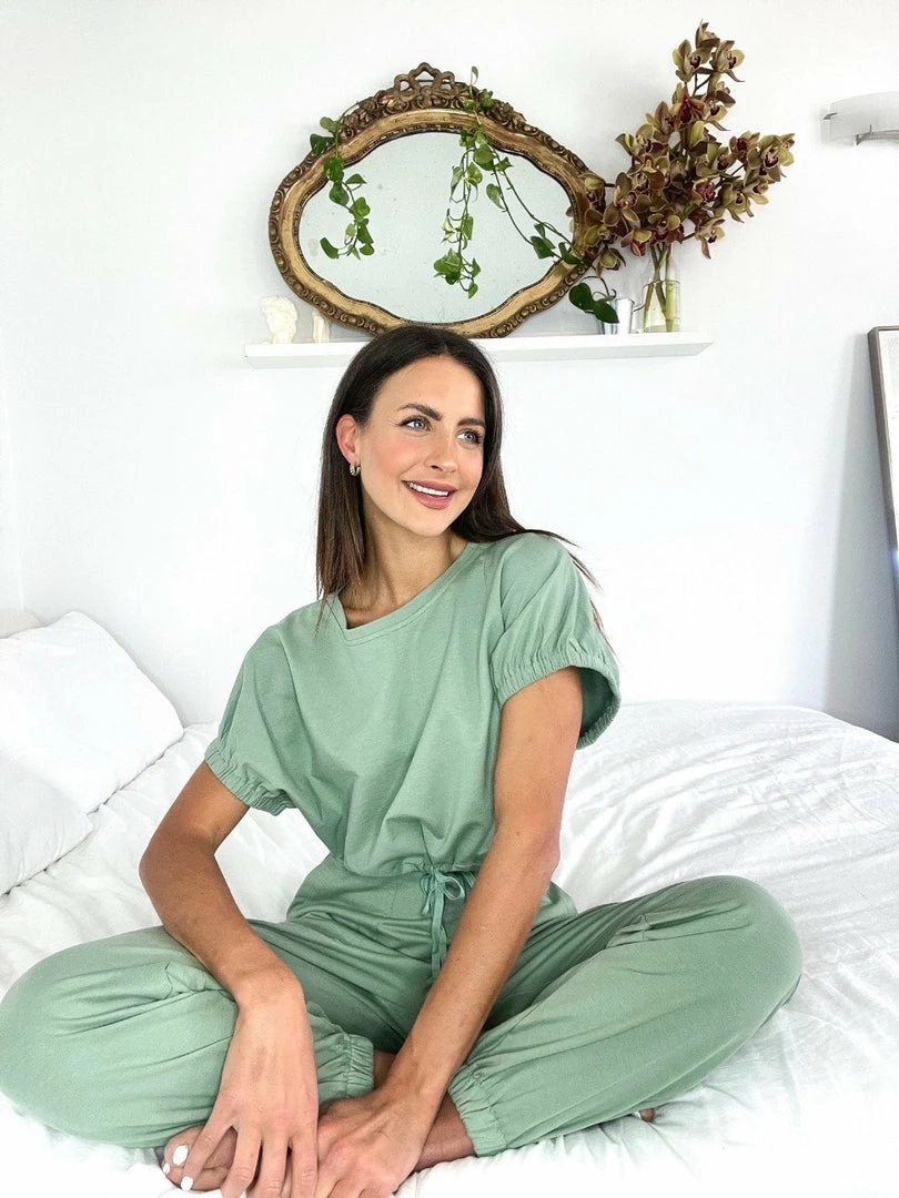 Our Ethna Pants come in a soft sage green tone. They feature pockets on the front sides, elasticated waist line and a fabric waist tie. Pair these pants with our Ethna Top to complete the look!