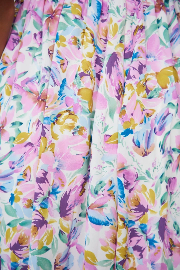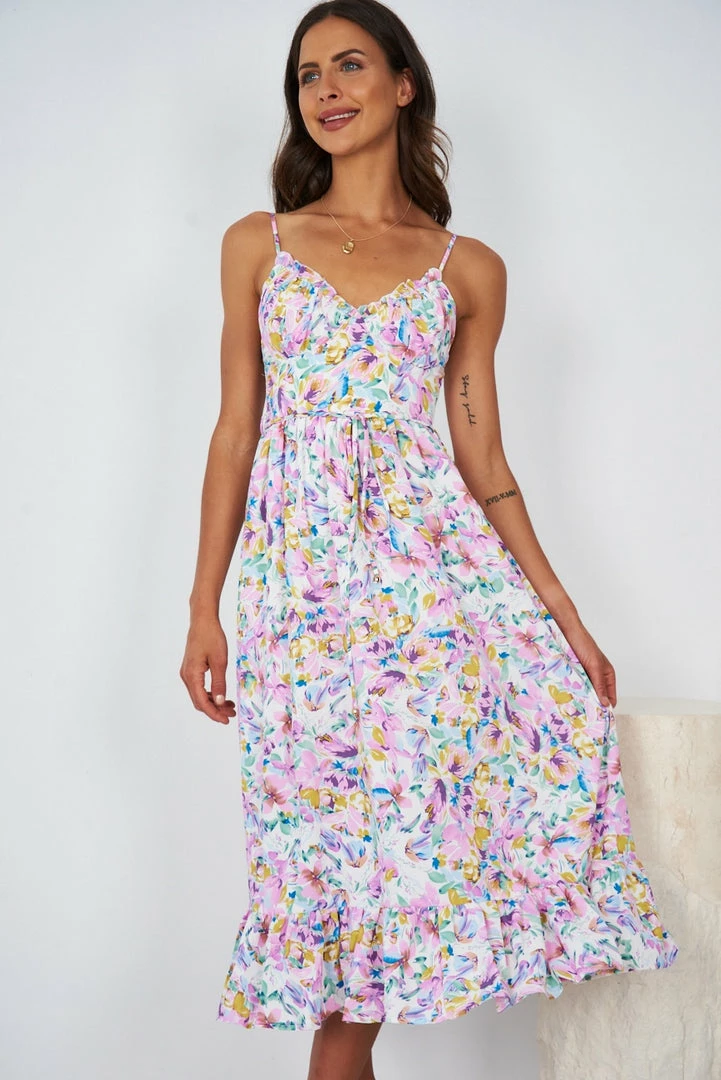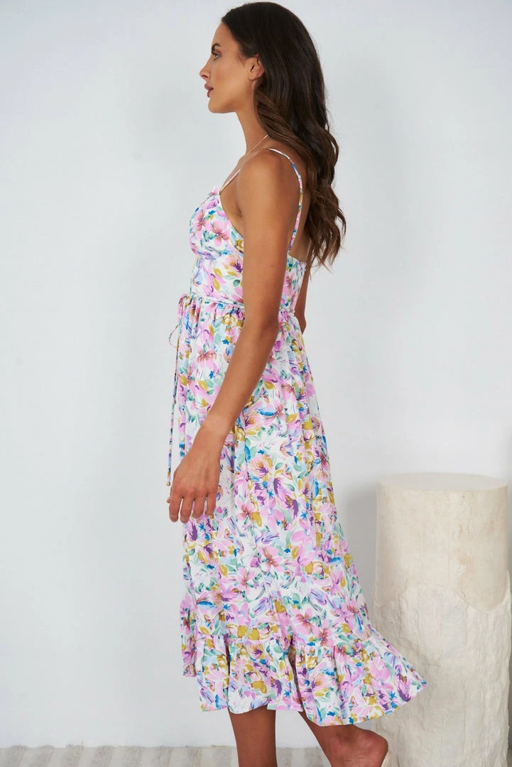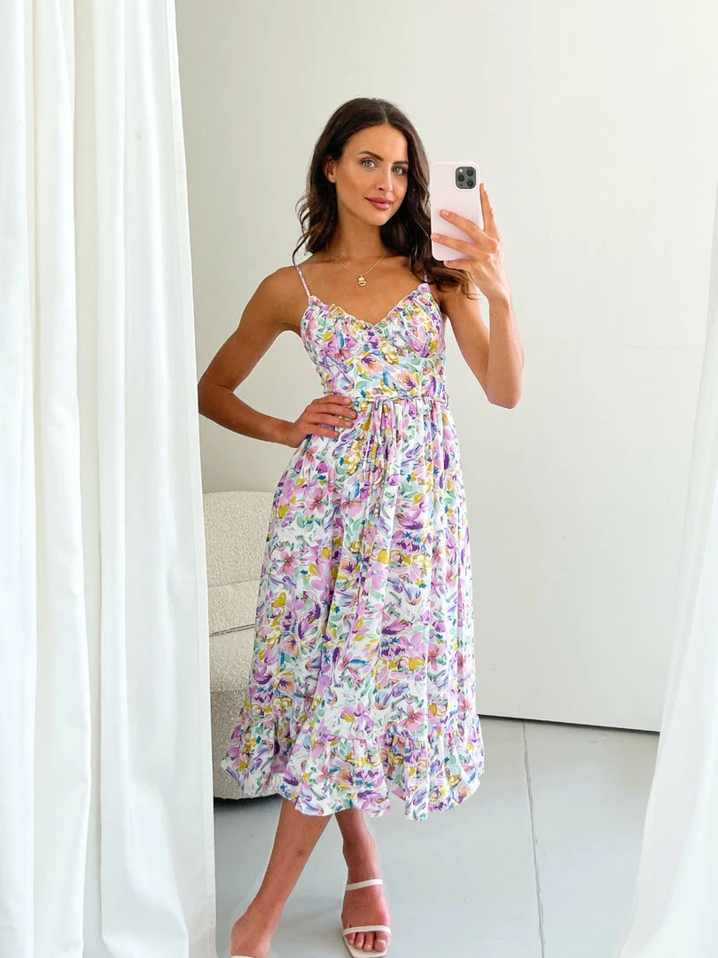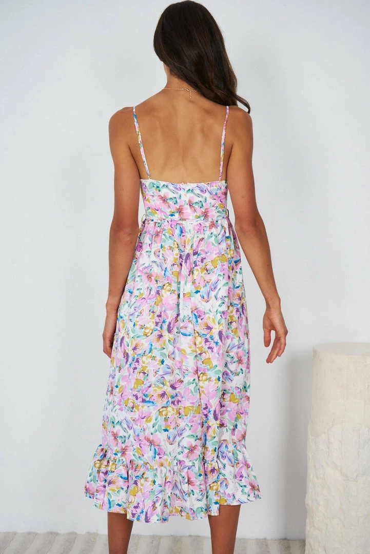 Our Haidee Dress comes in a white tone base, with a lilac, blue, gold & sage tone floral print. It features a v neckline & spaghetti straps for a relaxed, comfortable fit. This flowy, sleeveless midi pairs beautifully with heels for a stunning transseasonal look!