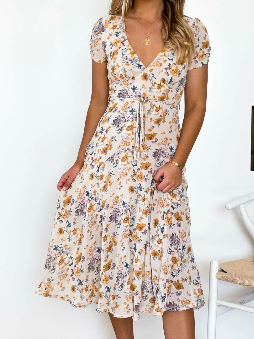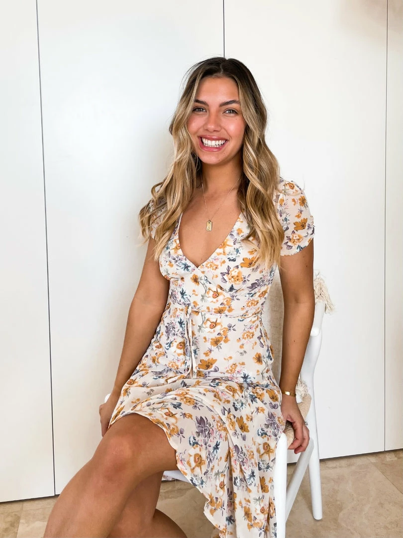 Our Halia Dress comes in a neutral beige tone base, with a contrasting yellow, purple & green floral print. It features a v neckline and short sleeves for a relaxed, comfortable fit. This flowy midi is the perfect piece for your next formal event!.
