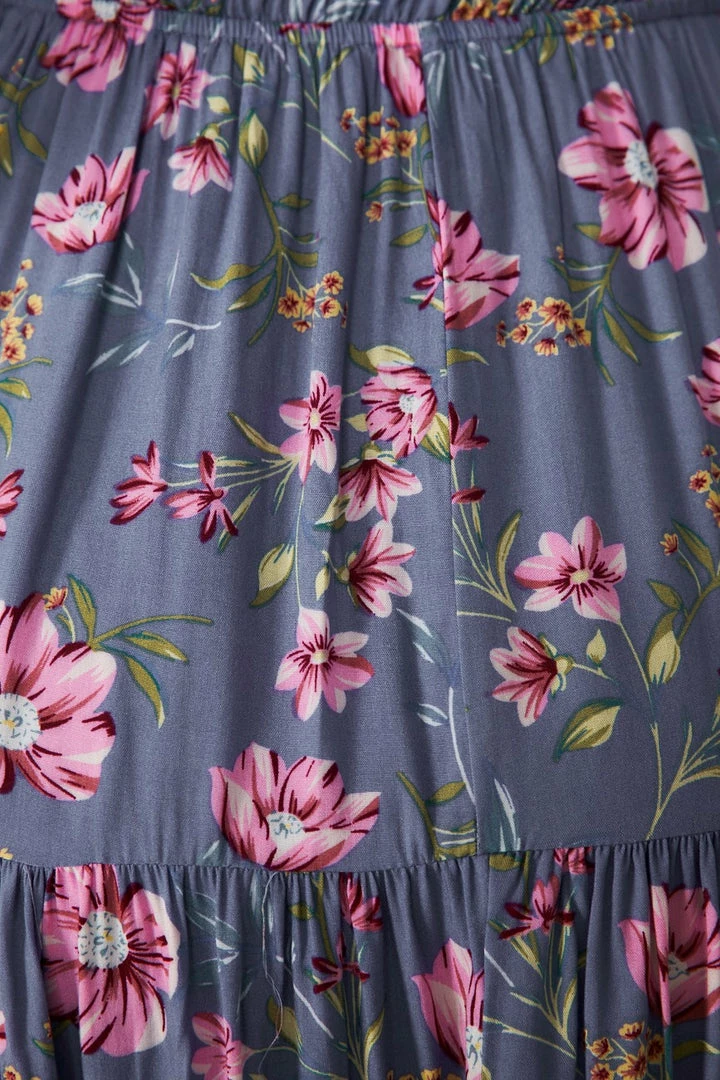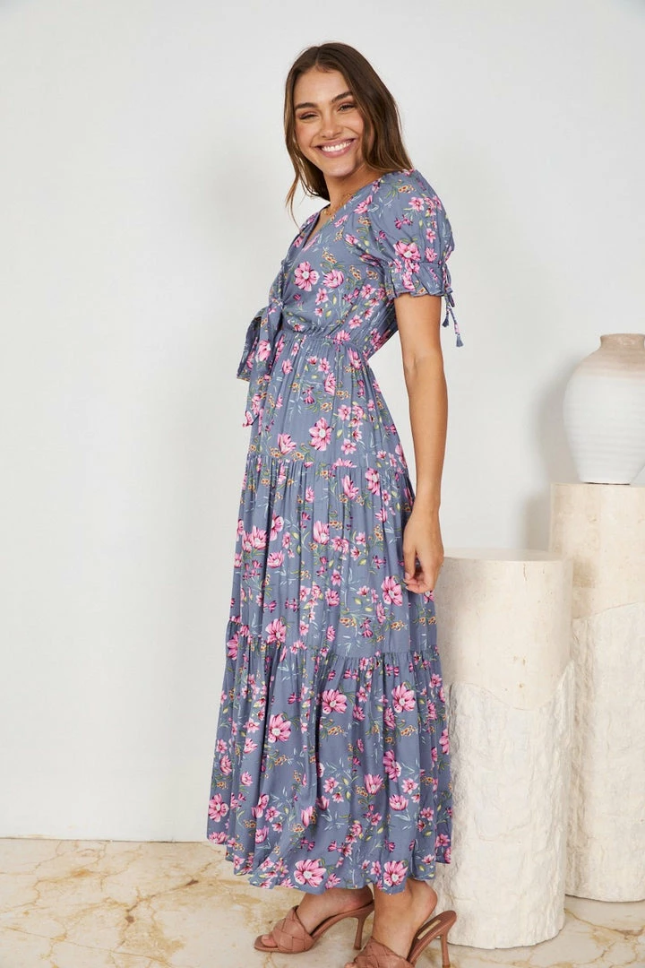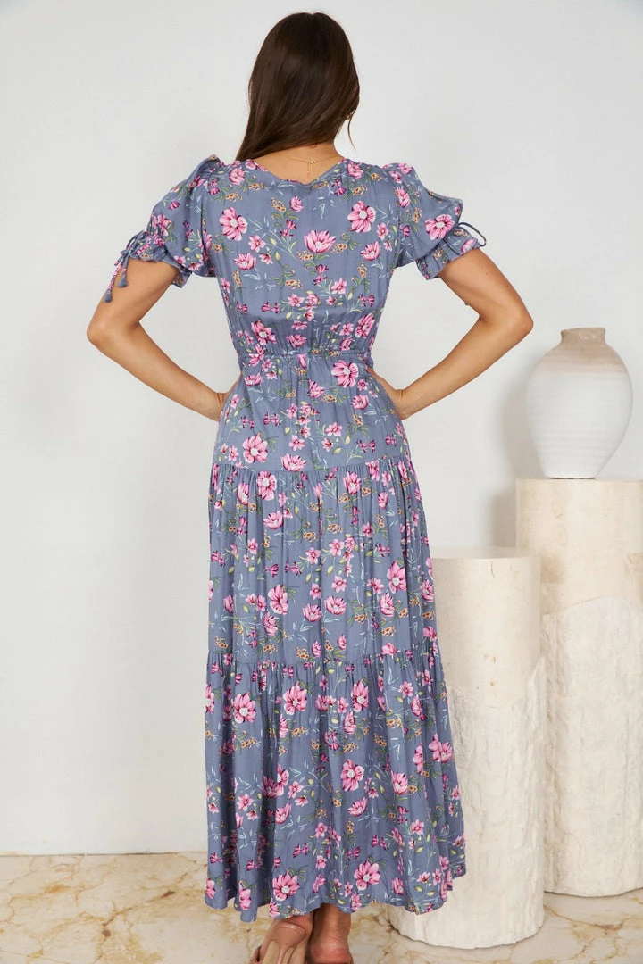 Our Lolita Dress comes in a floral print on a lovely purple base. It features a deep v-neckline with a gorgeous tie-up bust and is easily adjustable at the front. This flowy midi pairs beautifully with flats or heels for an effortless trans-seasonal look!