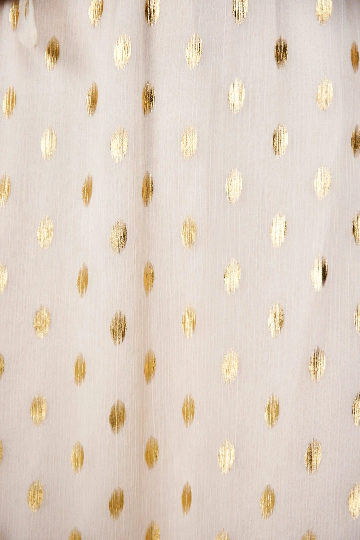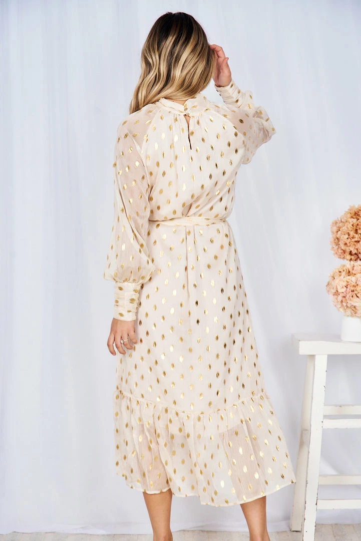 Our Annamae Dress comes in a warm cream tone base, with a contrasting gold tone spot print. It features a high neckline, long bishop sleeves, and a fabric waist tie to cinch in the figure beautifully. This stunning midi pairs beautifully with heels for an elegant, classy look!