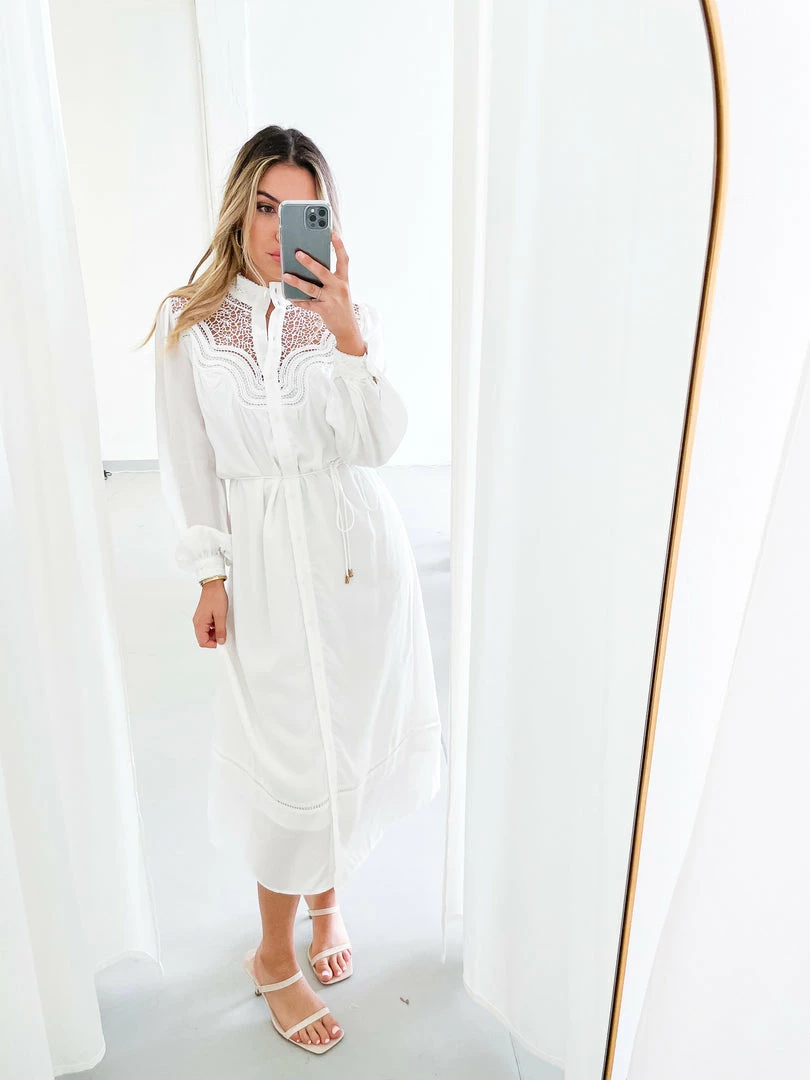 Our Calida Dress is a crisp white tone. It features a high neckline, long sleeves with traditional cuffs, and an embroidered pattern across the chest and shoulders. Pair with your favourite pair of heels for a stunning formal look!