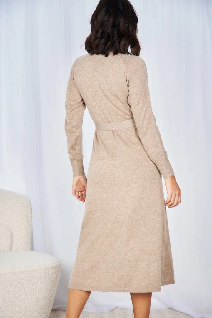 Our Rosamund Dress comes in a sand beige tone. It features a high gathered neckline, long fitted sleeves, and a fabric waist tie to cinch in the figure beautifully. This warm midi pairs beautifully with heels for an elegant casual look!
