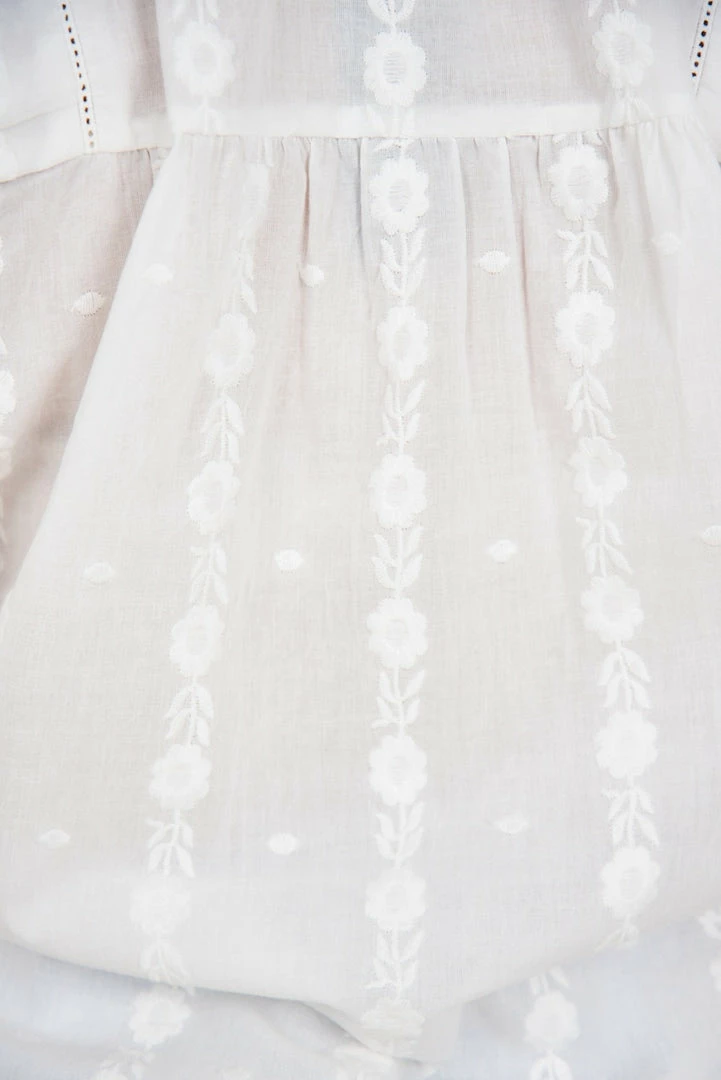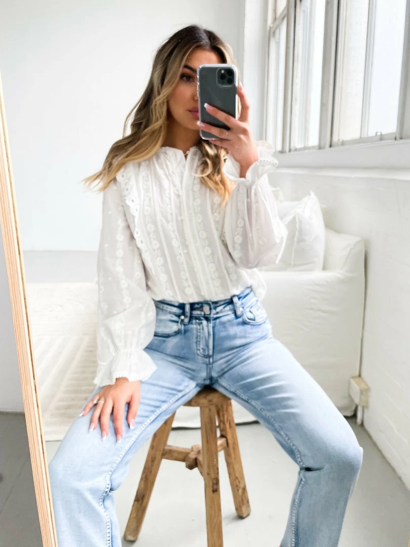 Our Kristie Top comes in a crisp white tone. It features a v neckline, long sleeves in cinched at the cuff, and an embroidered overlay across the chest. This cute top pairs beautifully with basic pants for an elegant look!