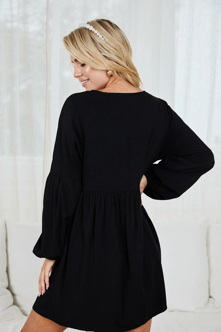 Our Adkins Dress comes in a classic black tone. It’s a gorgeous lightweight material and a relaxed fit perfect for growing baby bump. The v neckline, bishop long sleeves & gathered fabric detailing are feminine additions to this classy dress.