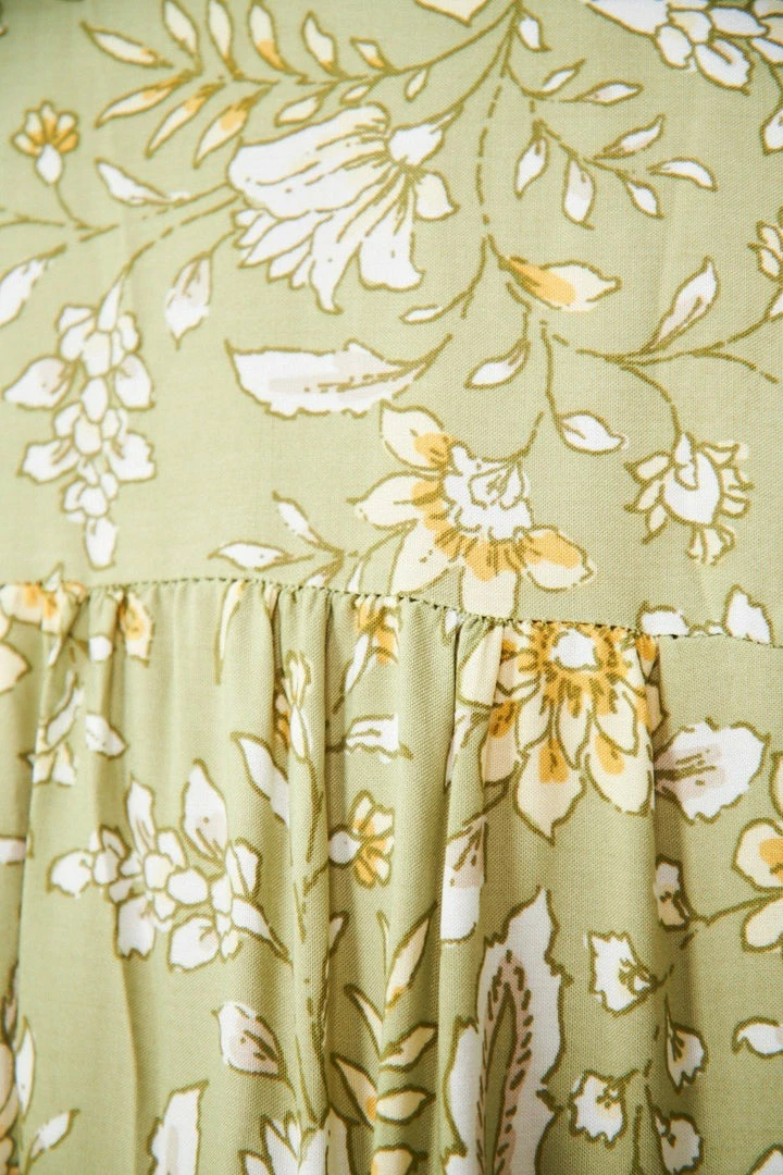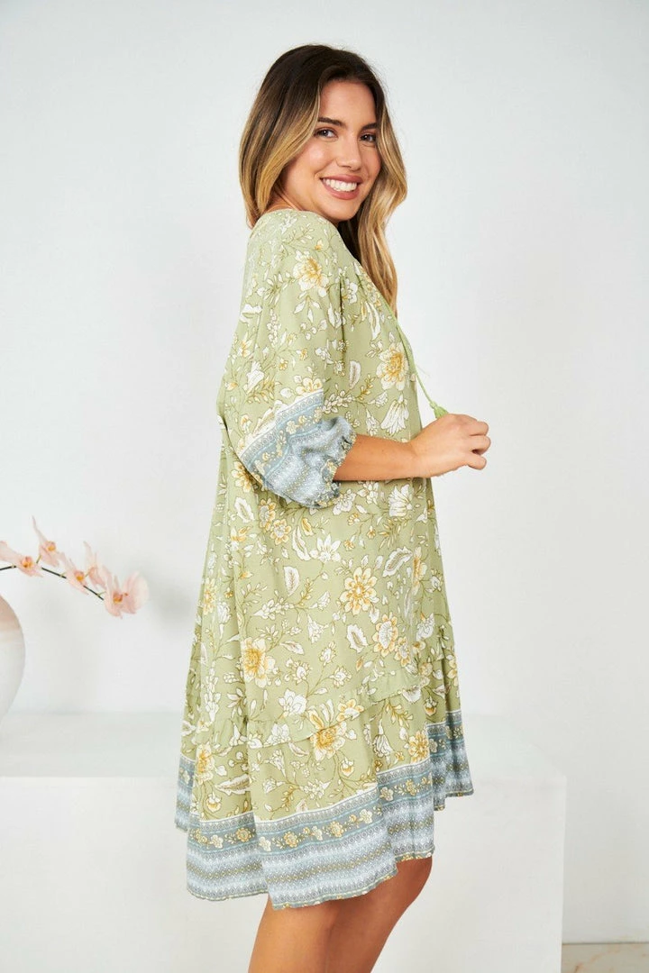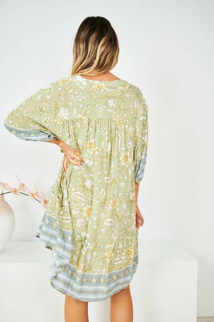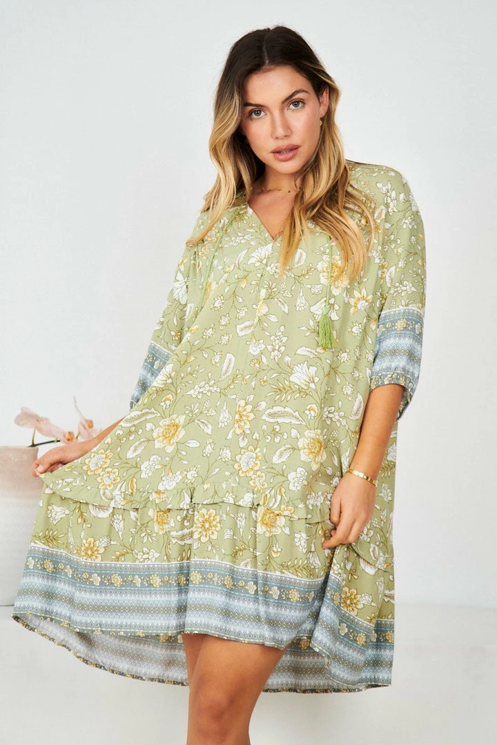 Our Aurina Dress comes in a green base with tones of grey, yellow and white prints. It’s a gorgeous lightweight material perfect for transitioning you to Spring. The peasant v neckline with tassel finishes is a gorgeous addition to this bohemian style. The short bishop sleeves are cinched with elastic on the cuffs making this practical and comfortable. The mini length is perfect for showing off your gorgeous legs!